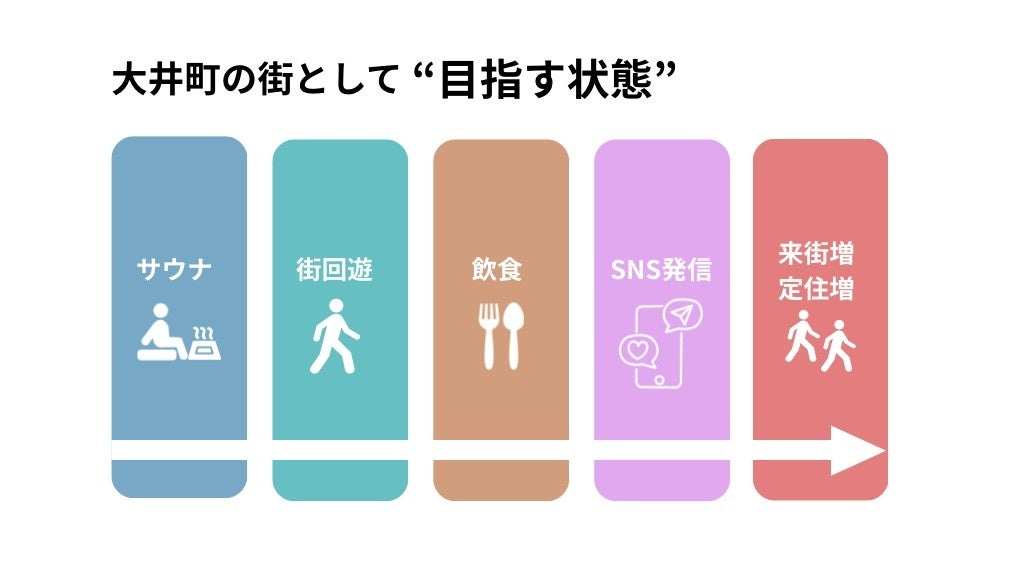 サウナをきっかけとして大井町に訪れた人々が、飲食店を利用するなどで滞在し、回遊する街として再定義を試みます。