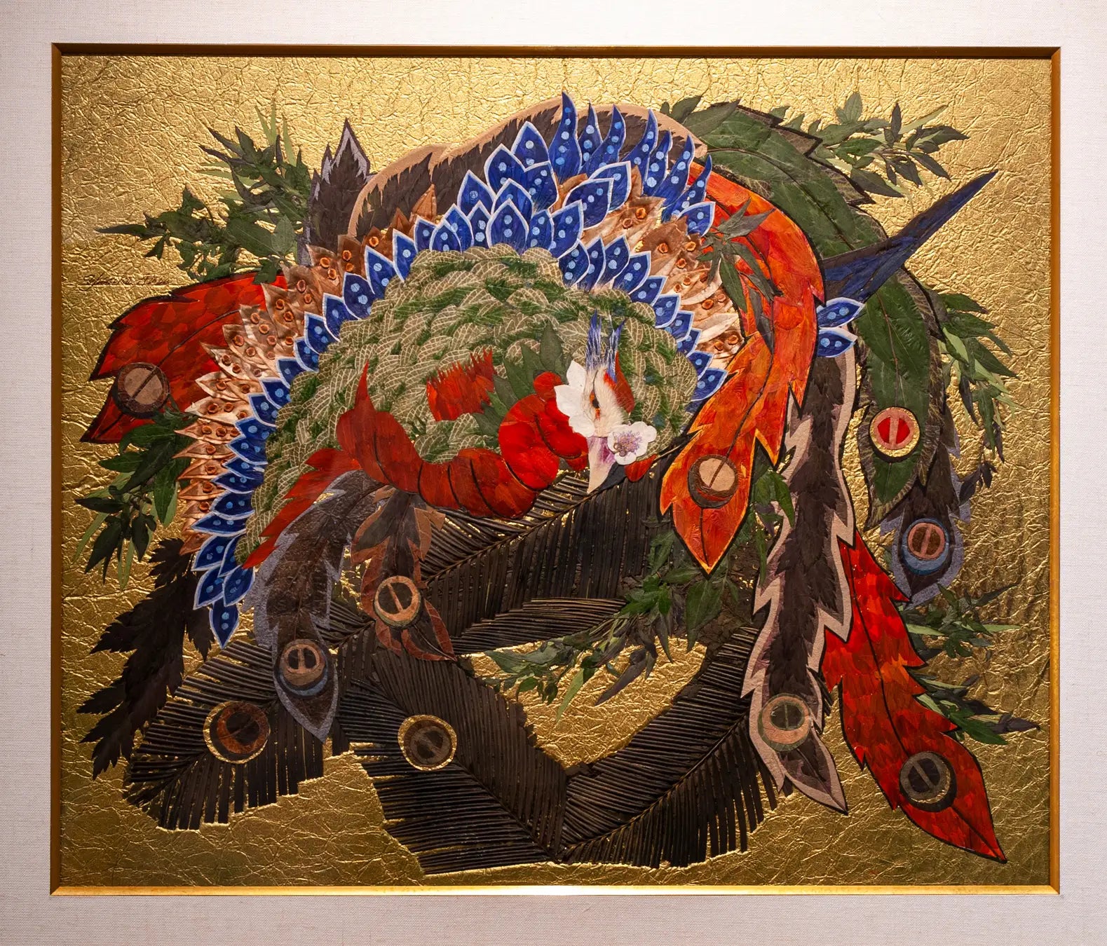 葛飾北斎が小布施岩松院に描いた「八方睨み鳳凰図」をモチーフに、すべてを植物で表現した「押し花鳳凰」では、普段は柔らかく優しい雰囲気の植物が力強い姿に変貌し、そのダイナミックな造形に衝撃を受けると同時に、押し花という表現の可能性に圧倒されます。