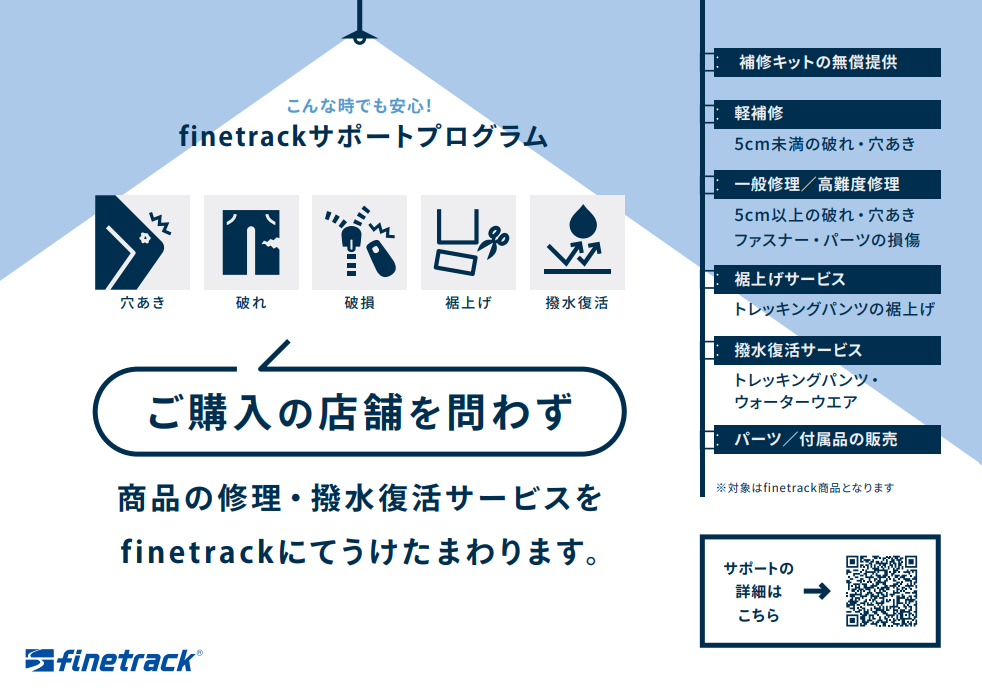 本プログラムは、finetrackのウエア・ギアを、より長く、より快適に使い続けていただくための登録制サポートサービスです。
