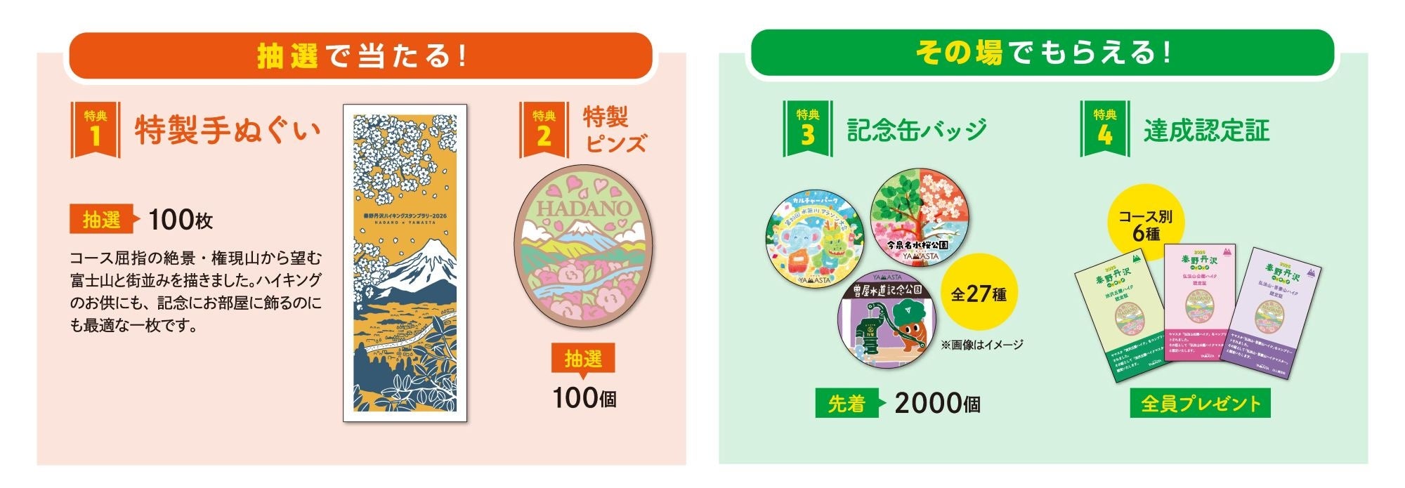 各コースを達成すると、記念缶バッジと達成認定証がもらえます。さらに、抽選で当たる特製手ぬぐいや、山のお土産ブランド「Yamasanka(ヤマサンカ)」とコラボした特製ピンズに応募できます。