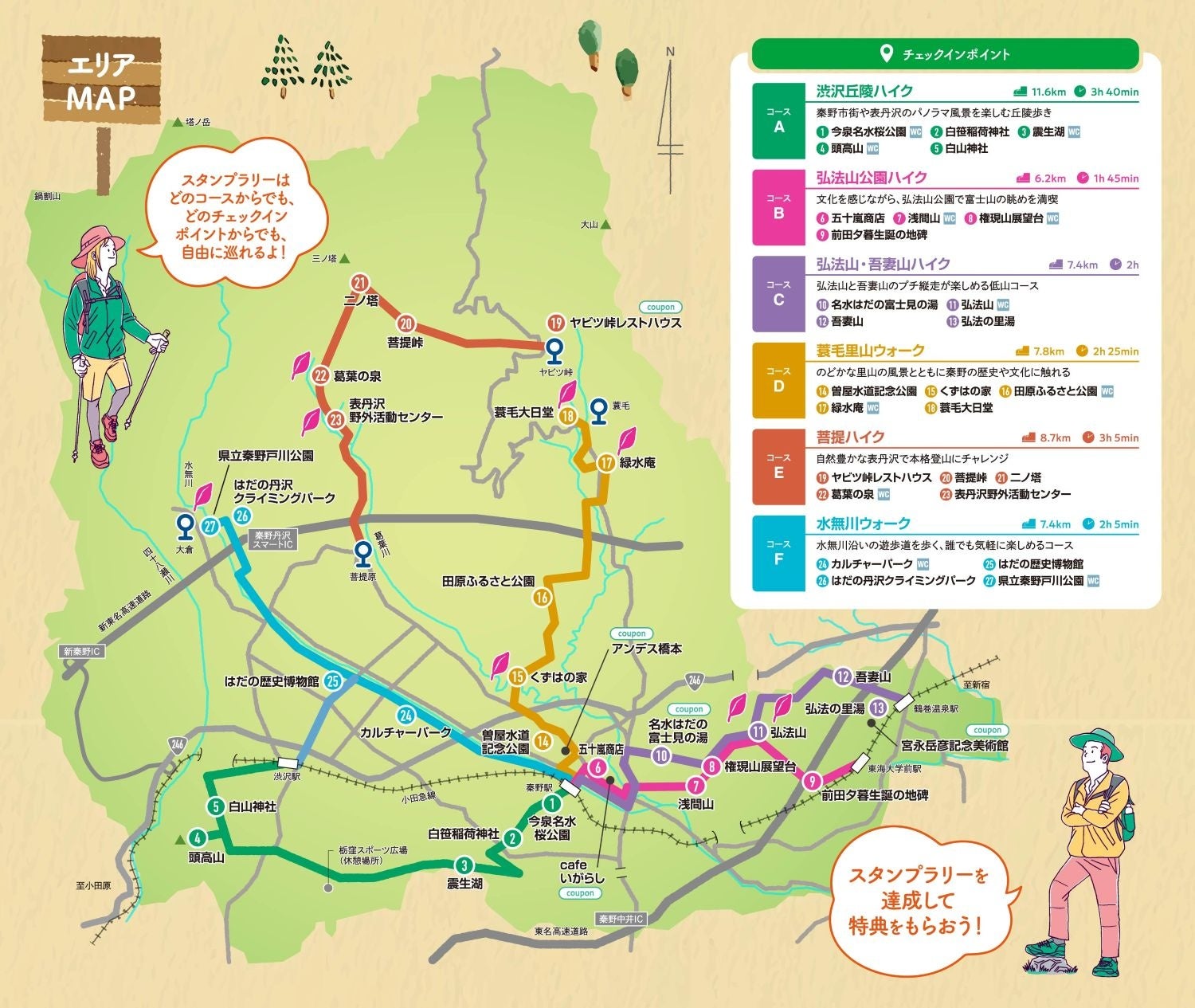 本イベントは、昨年約9,000人の方にご参加いただいた人気のスタンプラリーです。個性豊かな6つのコースを用意しており、秦野の自然を満喫できるハイキングや、雄大な表丹沢の景色を眺める登山、歴史ある街歩きなど、それぞれ異なる魅力を体験できます。