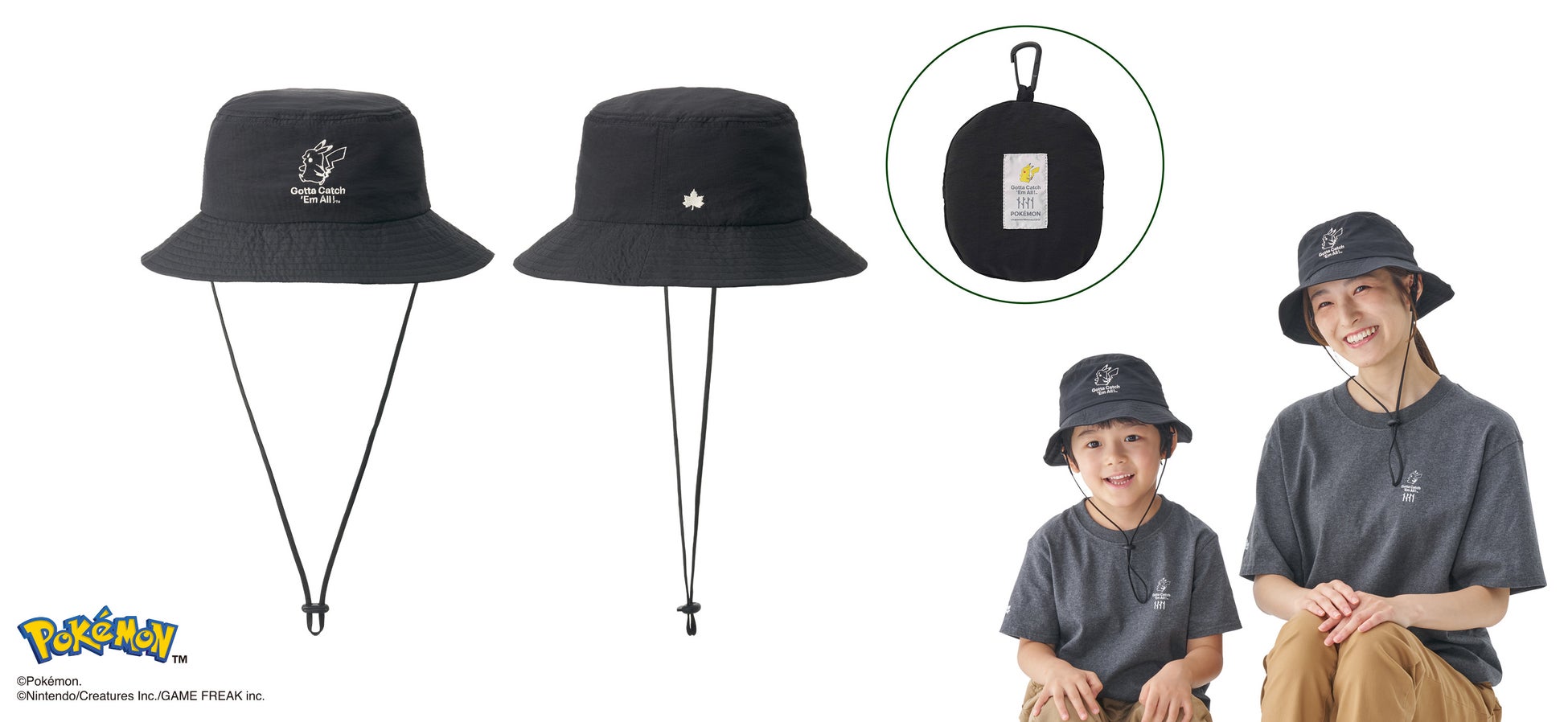 小さく折りたたんで持ち運べるポケットハット。大人サイズとキッズサイズの2サイズ展開で、生地にはピカチュウとロゴスのロゴマークであるメイプルリーフの刺繍が施され、親子でお揃いを楽しめる。一体型の収納袋はカラビナ付きで、コンパクトに収納してカバンやリュックに引っ掛けて持ち運びべるほか、軽量でシワになりにくい生地を採用。