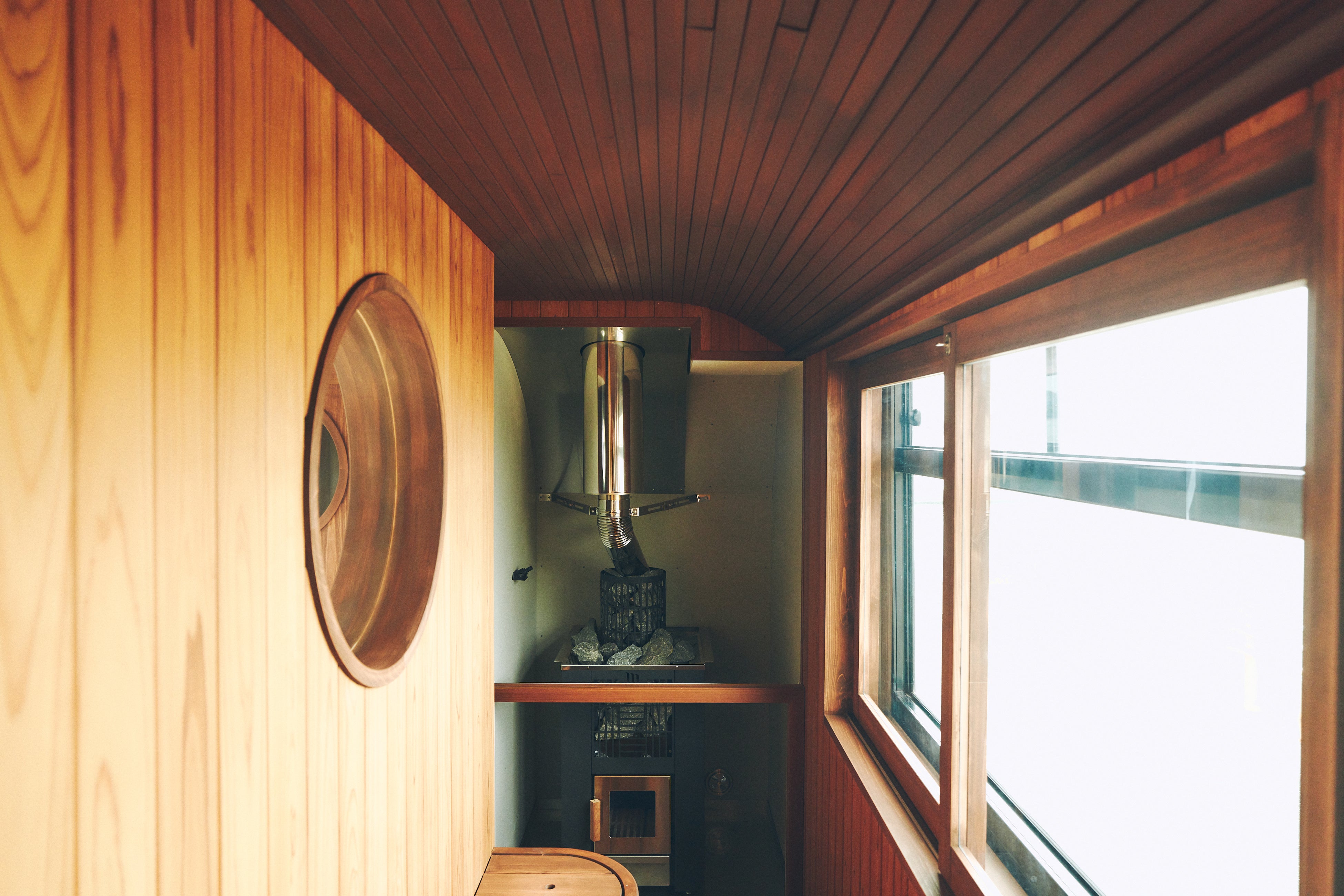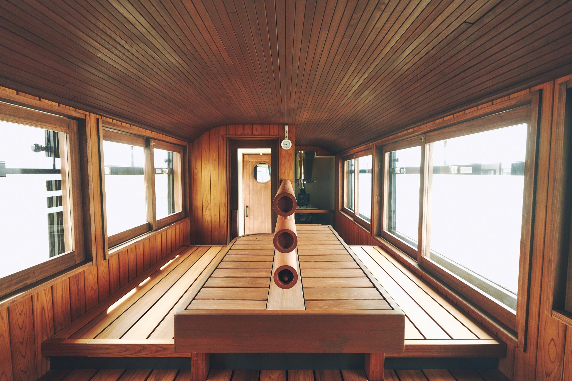 サバス4号車のコンセプトは、浜松の名産「うなぎ」です。サウナ室は、町家の細長い構造を指す「うなぎの寝床」をモチーフに採用しました。奥行きのある細長い空間設計は、座ると自然と視線が窓へと導かれるよう設計しています。 これにより、利用者同士の視線が気になりにくく、落ち着いた空間体験を生み出します。空間だけでなく、ロウリュの演出や香りなど、五感を通してうなぎの世界観を感じられる体験も準備中です。