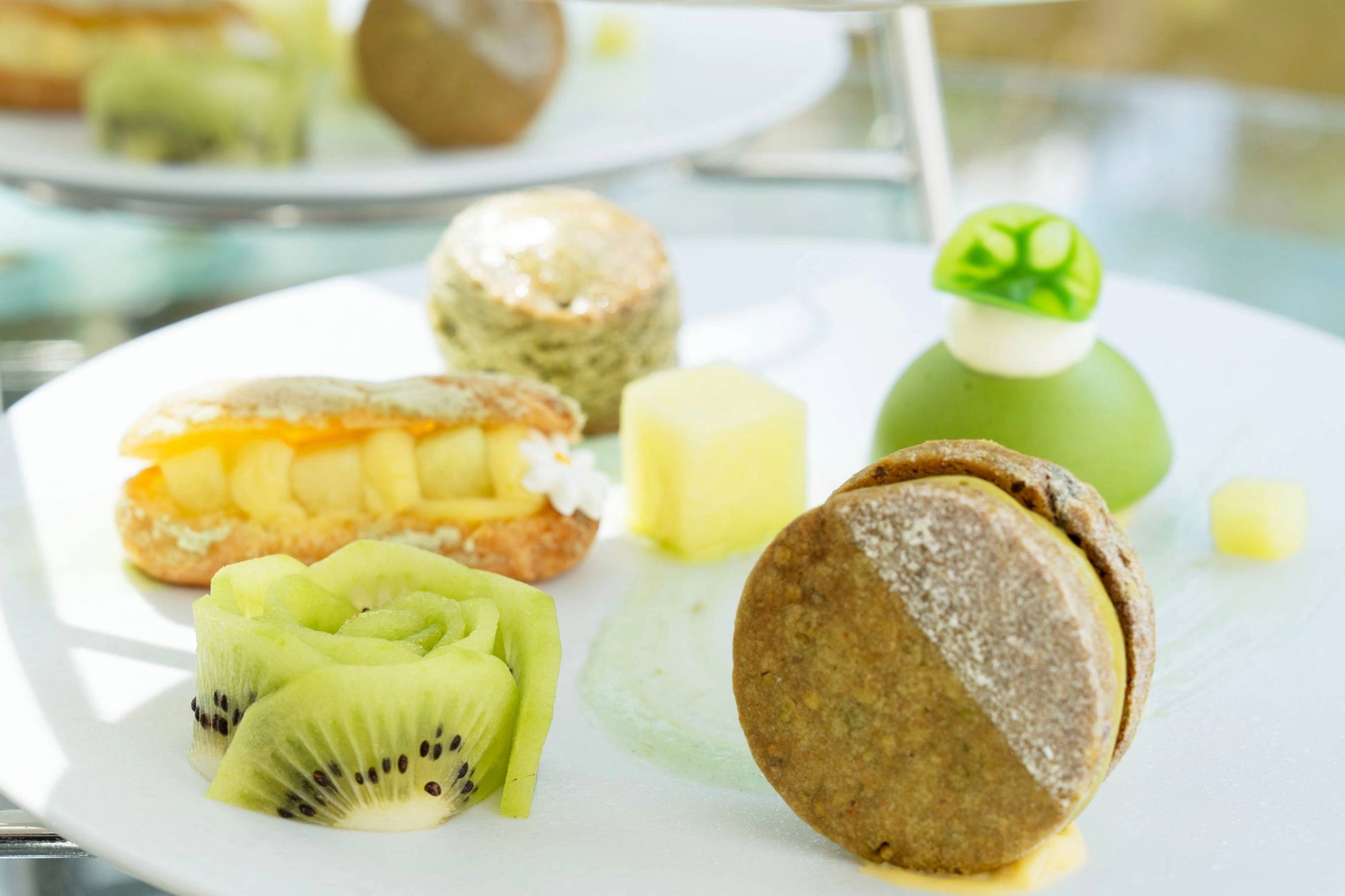 初夏の訪れを感じる1段目に続き、2段目には抹茶モンブランなど和洋のエッセンスを織り交ぜたスイーツが並びます。南国の軽やかな甘みのマンゴーソースがアクセントのメロンムースやメロンマカロン、しっとり食感の抹茶フィナンシェなど今だけの味わいのハーモニーをお楽しみいただけます。