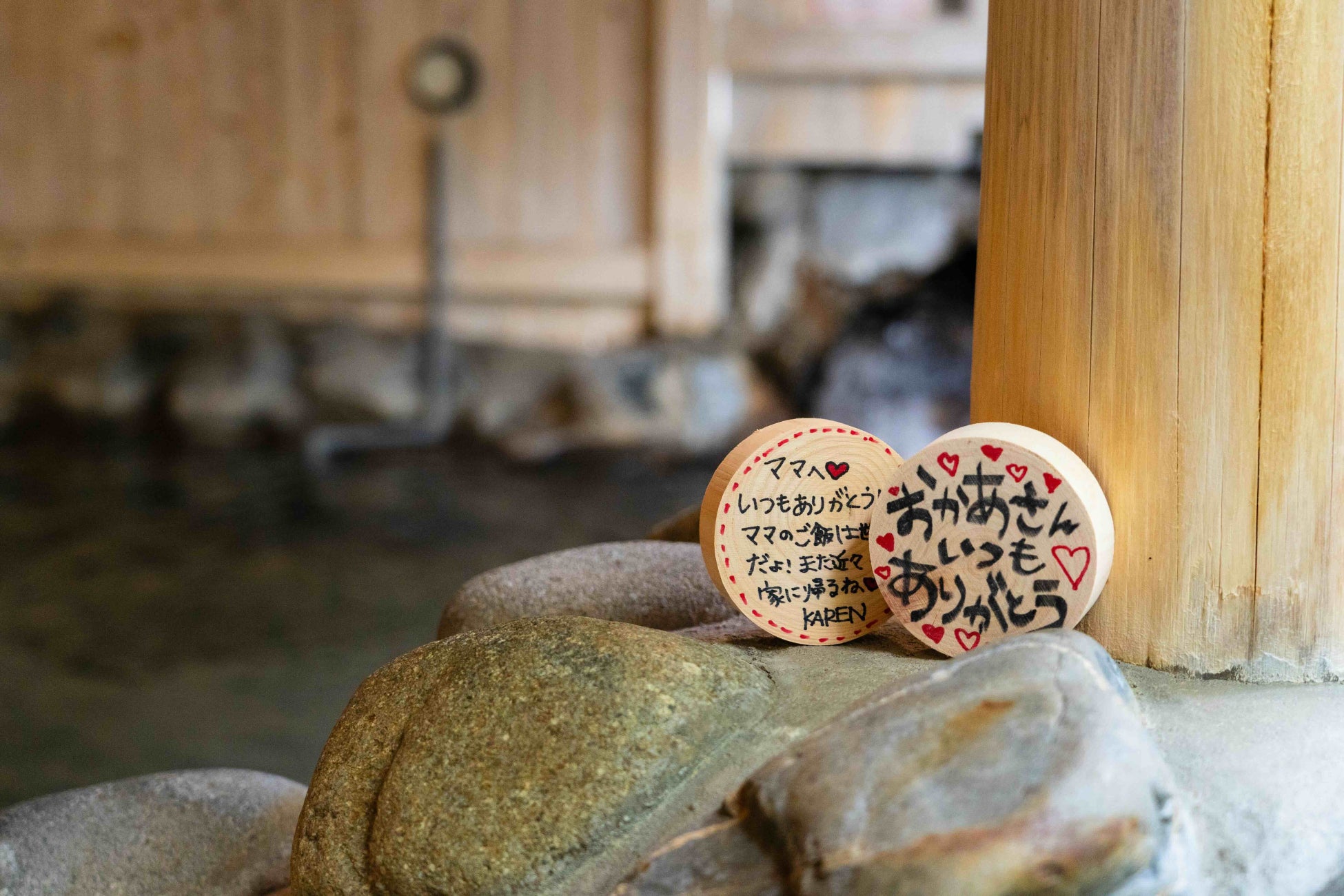 昭和レトロな温泉銭湯 玉川温泉が「母の日イベント」に向けて、学童保育の子供たちを訪問。地元間伐材のヒノキ入浴木にメッセージをもらいます