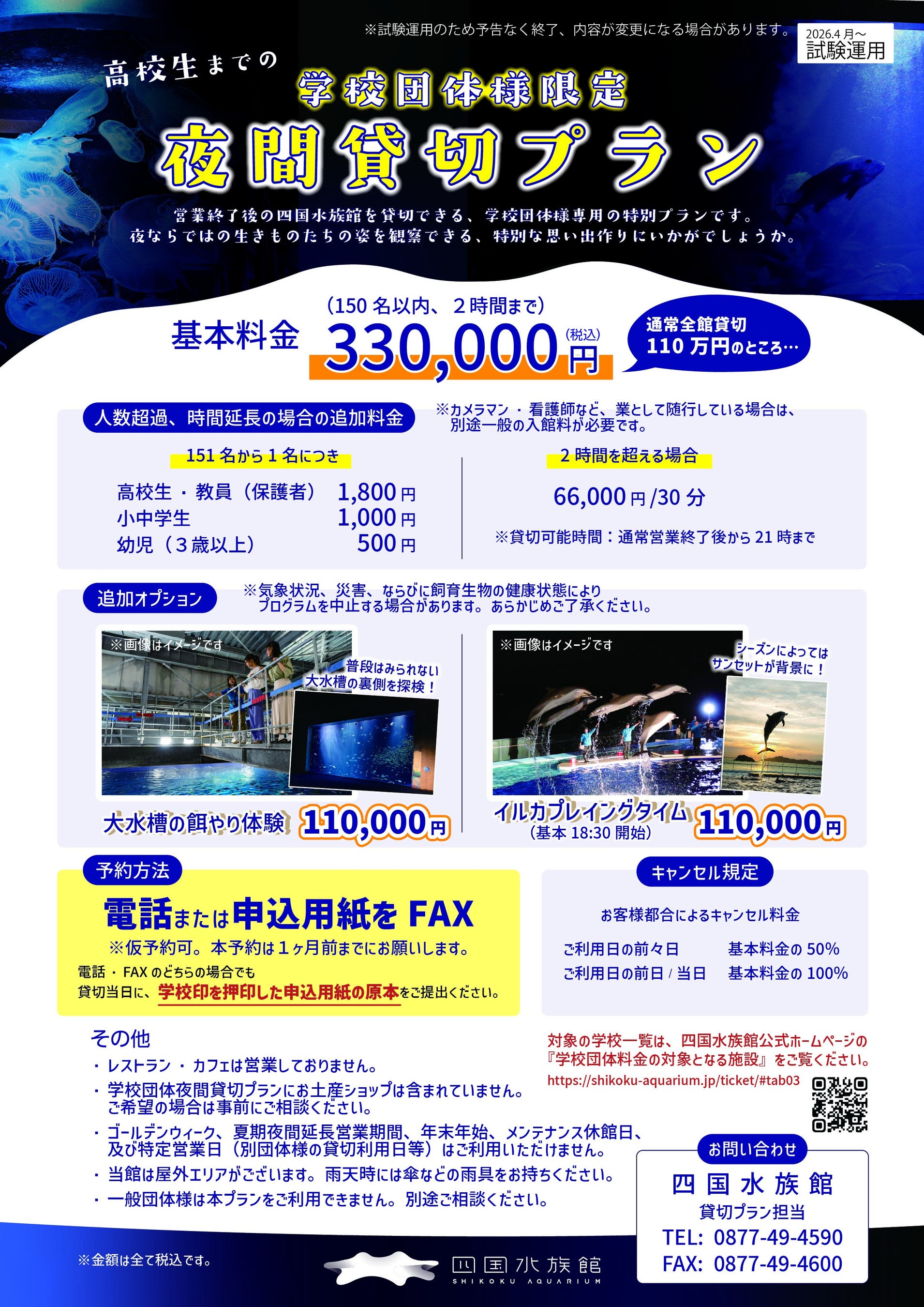 四国水族館(所在地:香川県綾歌郡宇多津町)は、学校団体を対象とした夜間貸切プランを受付しています。