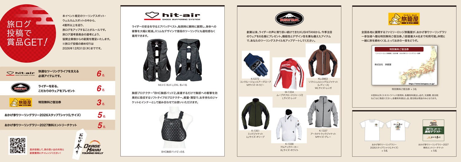 旅ログの景品には、hit-air エアーバッグベスト、胸部パッド、KUSHITANI グラーブ、ジャケット、旅籠屋 特別無料宿泊券などの豪華景品が各社の協賛により進呈されます。