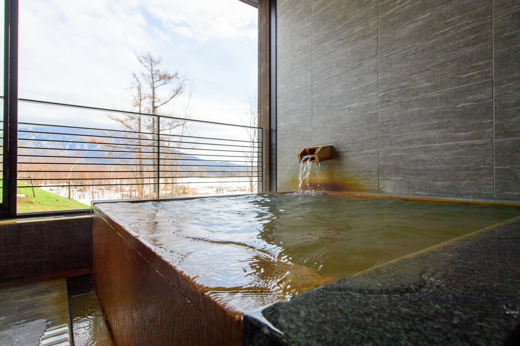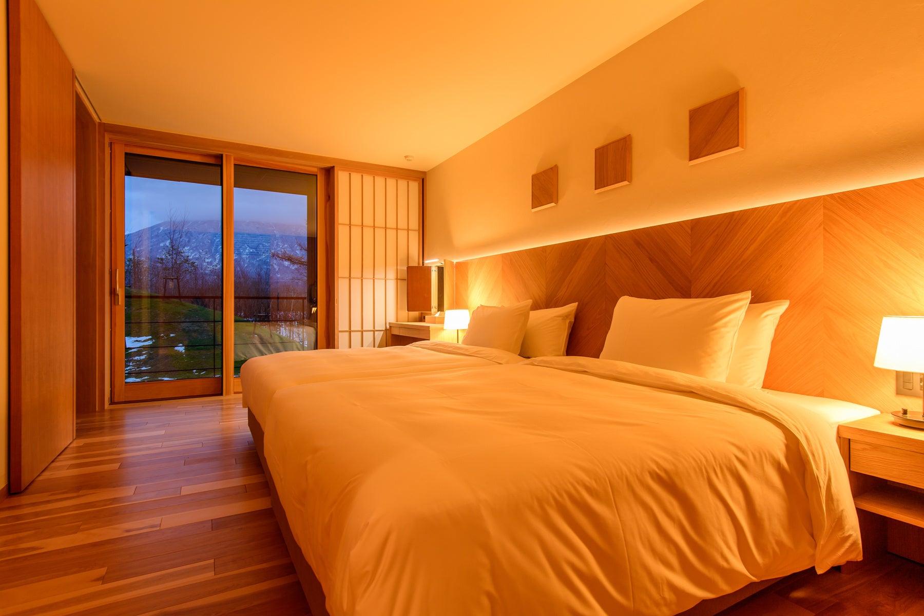 客室は、広いリビングルームとツインベッドルーム、源泉かけ流しの湯から望む、壮観な羊蹄山の雄姿をご堪能。非日常と寛ぎを心行くまでお楽しみください。