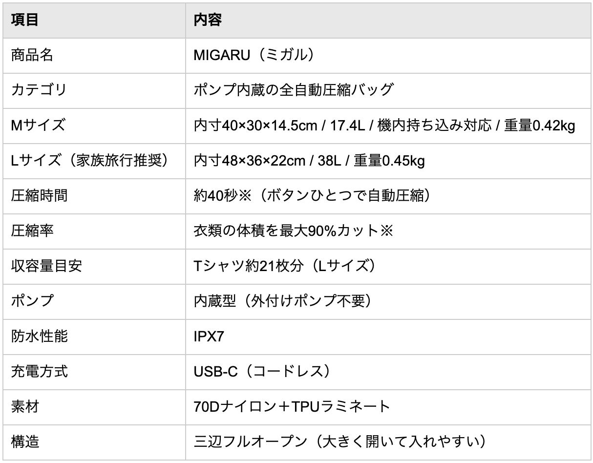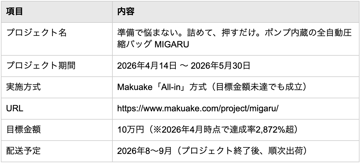 ・ ポンプ内蔵の全自動圧縮バッグ「MIGARU」Lサイズ(38L)が、家族4人分の着替えを約40秒で一括圧縮。Makuakeにて先行販売中(〜5月30日)、リターン配送は2026年8〜9月予定。GW・母の日当日に現物は届かない前提で、お盆の帰省(8月後半)・秋の連休・冬の旅行向けギフトとして提案。