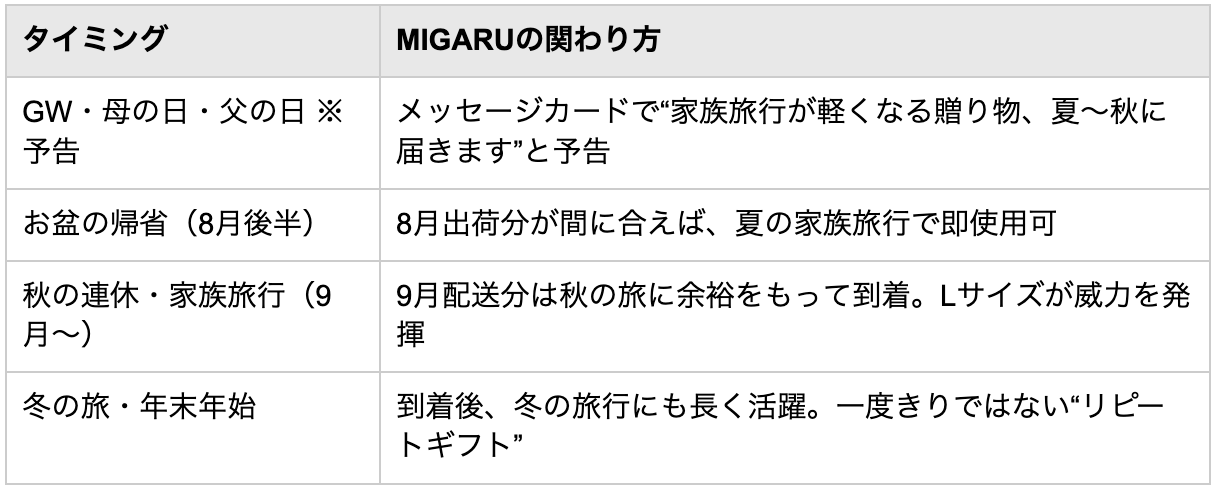 MIGARUはMakuakeでの先行販売のため、リターンの配送は2026年8〜9月を予定しています。そのため本リリースでは、GW・母の日・父の日は“先取り予告ギフト”として、お盆の帰省(8月後半)・秋の連休・冬の旅は“現物が間に合う実用ギフト”として、2段階の贈り方を提案します。