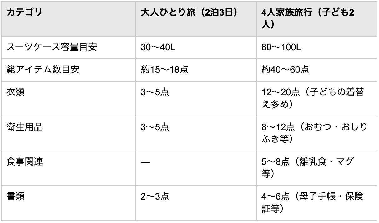 大人ひとり旅の2泊3日に必要なスーツケース容量は30〜40L。子ども2人を連れた4人家族になると80〜100Lが必要になります。荷物量は約2.5〜3倍に膨れ上がります。持ち物アイテム数で比較すると、その差はさらに明確です。