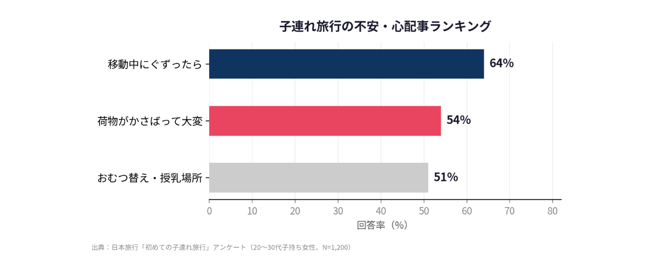 日本旅行が20〜30代の子持ち女性1,200名を対象に実施したアンケートによると、子連れ旅行の不安・心配事ランキングは、1位「移動中にぐずったら」64%、2位「荷物がかさばって大変」54%、3位「おむつ替え・授乳場所」51%となっています。つまり、2人に1人以上が“荷物のかさばり”に不安を抱えているという結果です。