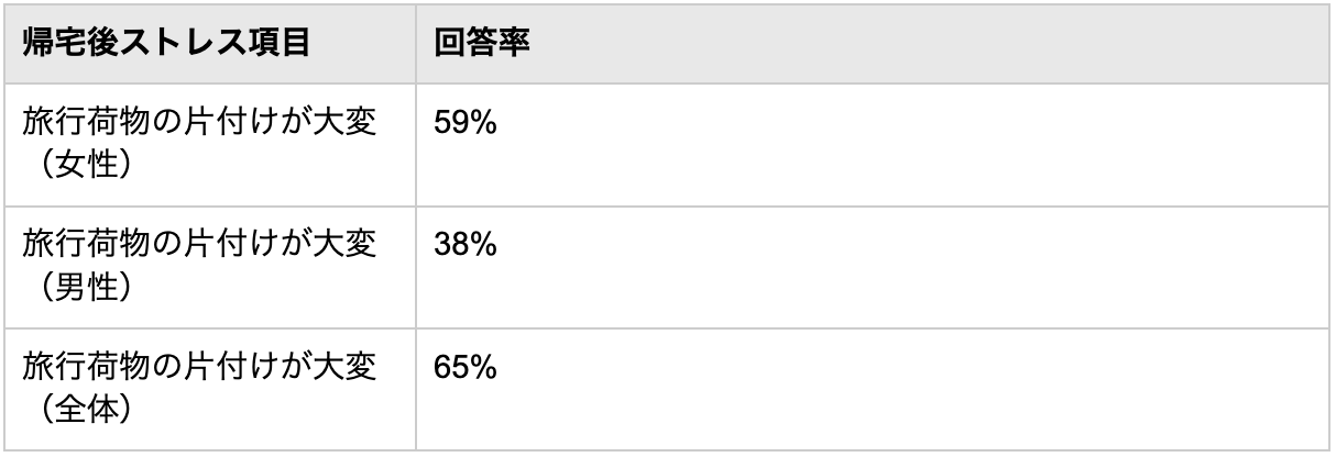 いこーよ総研の調査によれば、0〜1歳児のいる家庭では、家族旅行全般で“準備する荷物の多さ”にストレスを感じている割合が高く、旅行の“後”にもストレスが続くことが示されています。帰宅後の「旅行荷物の片付けが大変」は、女性の59%・男性の38%が挙げています(全体では65%)。