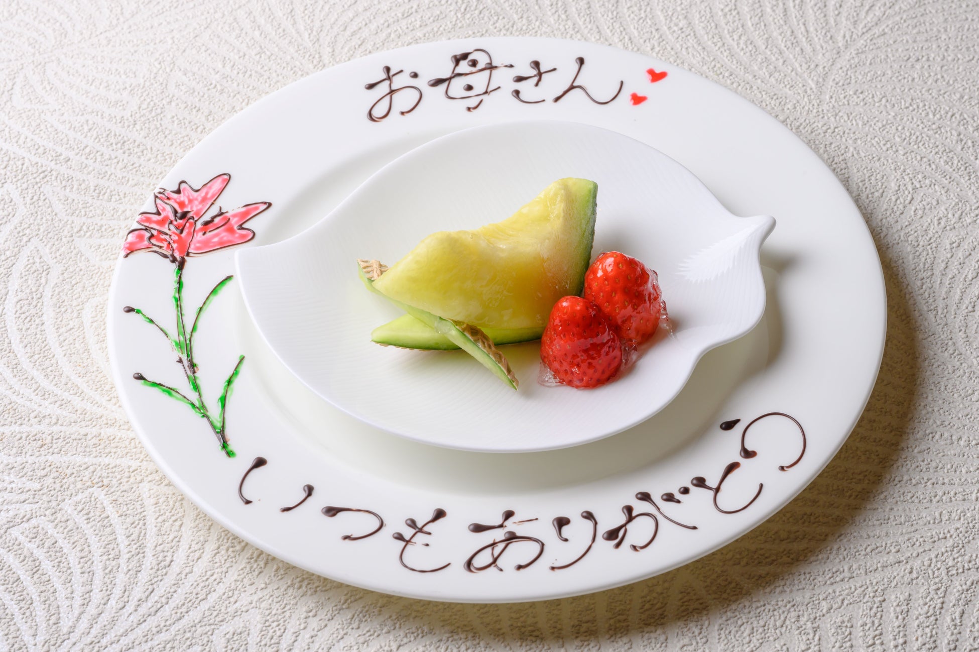 ご夕食には、日頃の感謝の気持ちを込めたメッセージを添えたデザートプレートをご提供し、さらにオプションでフラワーアレンジメントやケーキなどもご用意いたします。