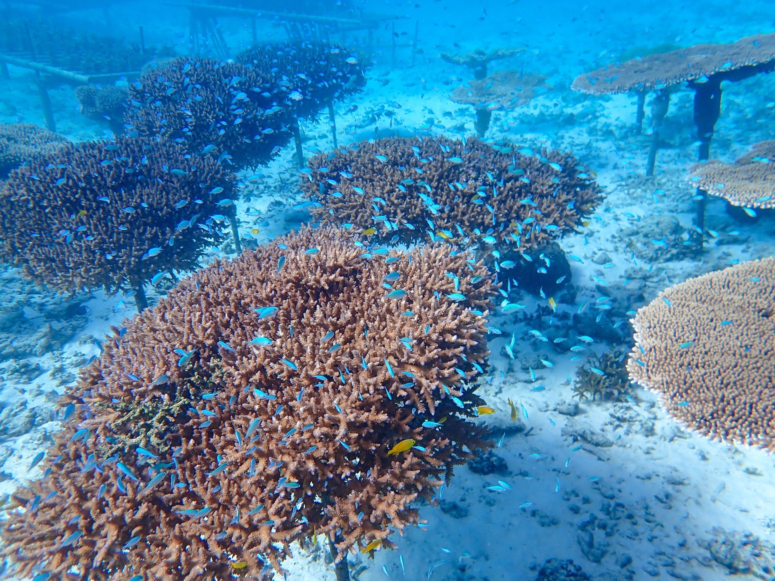 再生プロジェクトのサンゴは成長が早く、約10年で1m近いサイズに成長!複数回の産卵も確認できました。周囲でもサンゴが増加したことから、サンゴ礁再生プロジェクトは別エリアでもサンゴの育成をスタート!