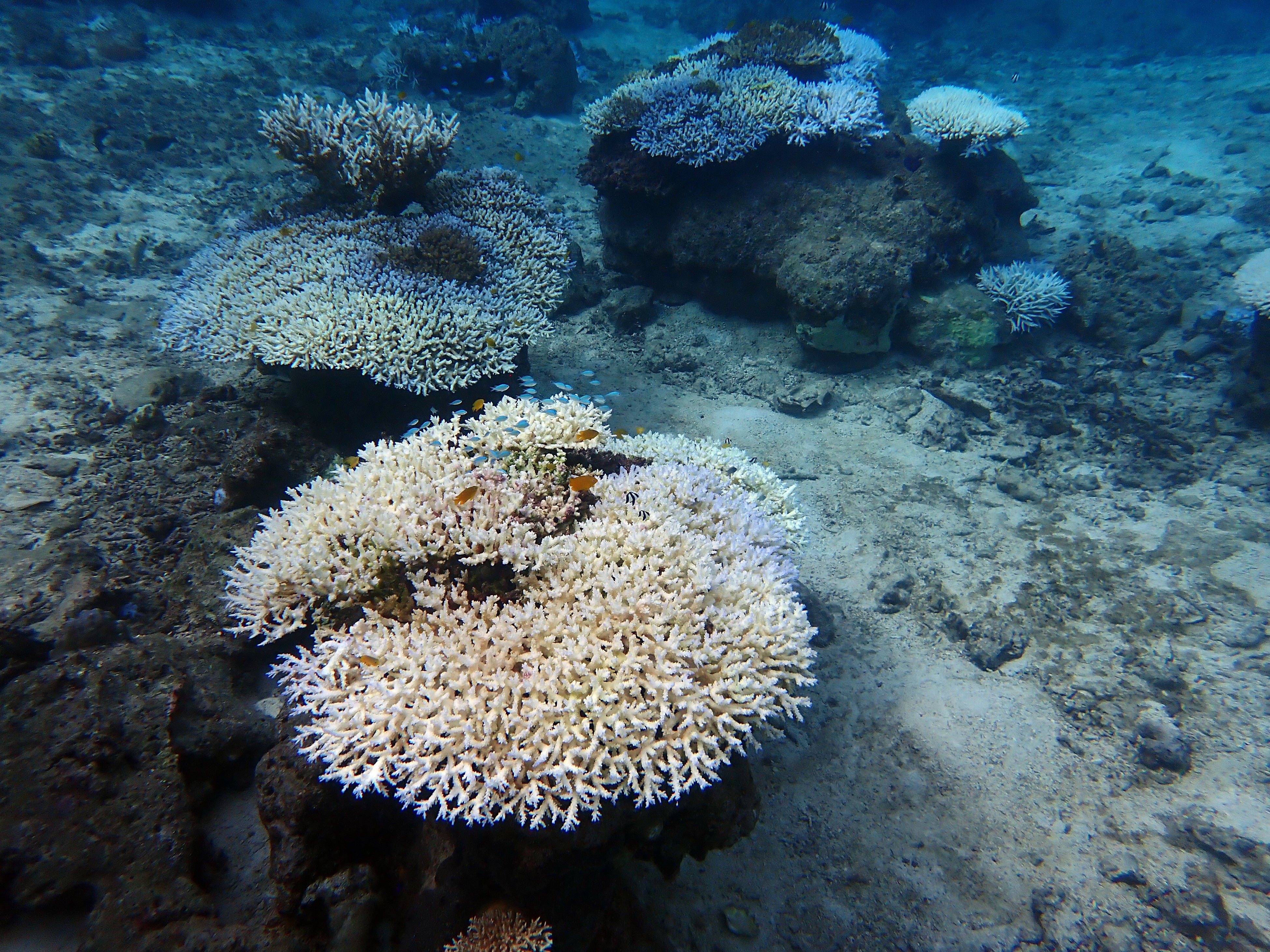 7月~9月までの約3ヶ月にわたる高水温により、再び大規模の白化現象が発生。植え付けしたサンゴの83%が死滅(44/53群体)、ひび建て式で育成中のサンゴ*の61%が死滅(58/95群体)という辛い経験となりました。死んだサンゴの骨格には褐色の藻が付着。海の姿は一変していました。