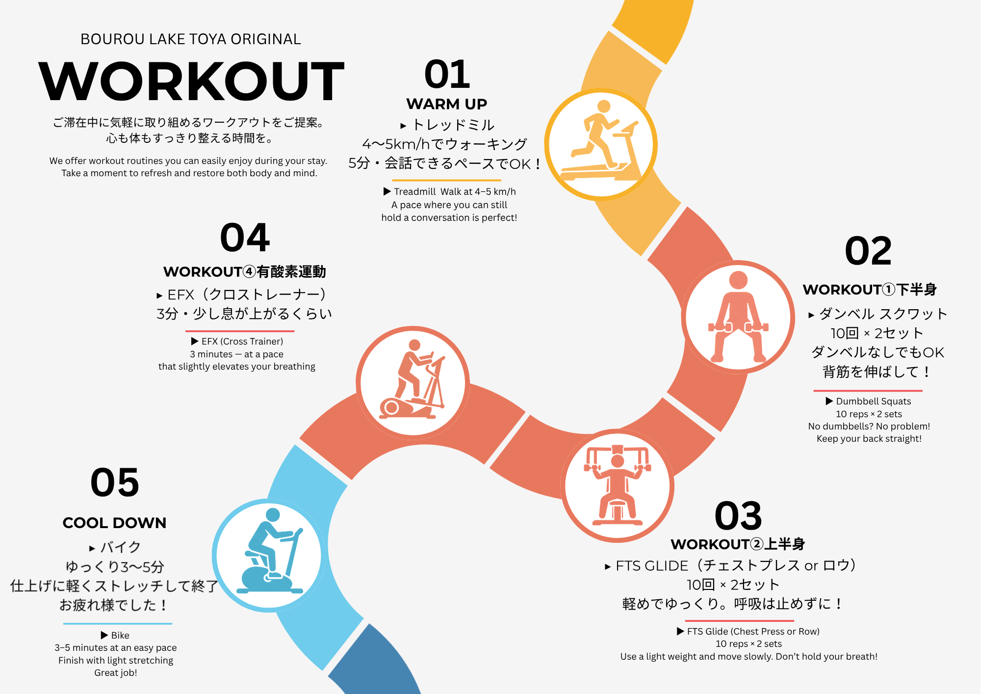 非日常の滞在の中で、自分自身のコンディションに静かに向き合うひととき。身体を動かして整える時間と、温泉でほどけていく時間。その両方を行き来することで、滞在はより深く、心地よいものへと変わっていきます。