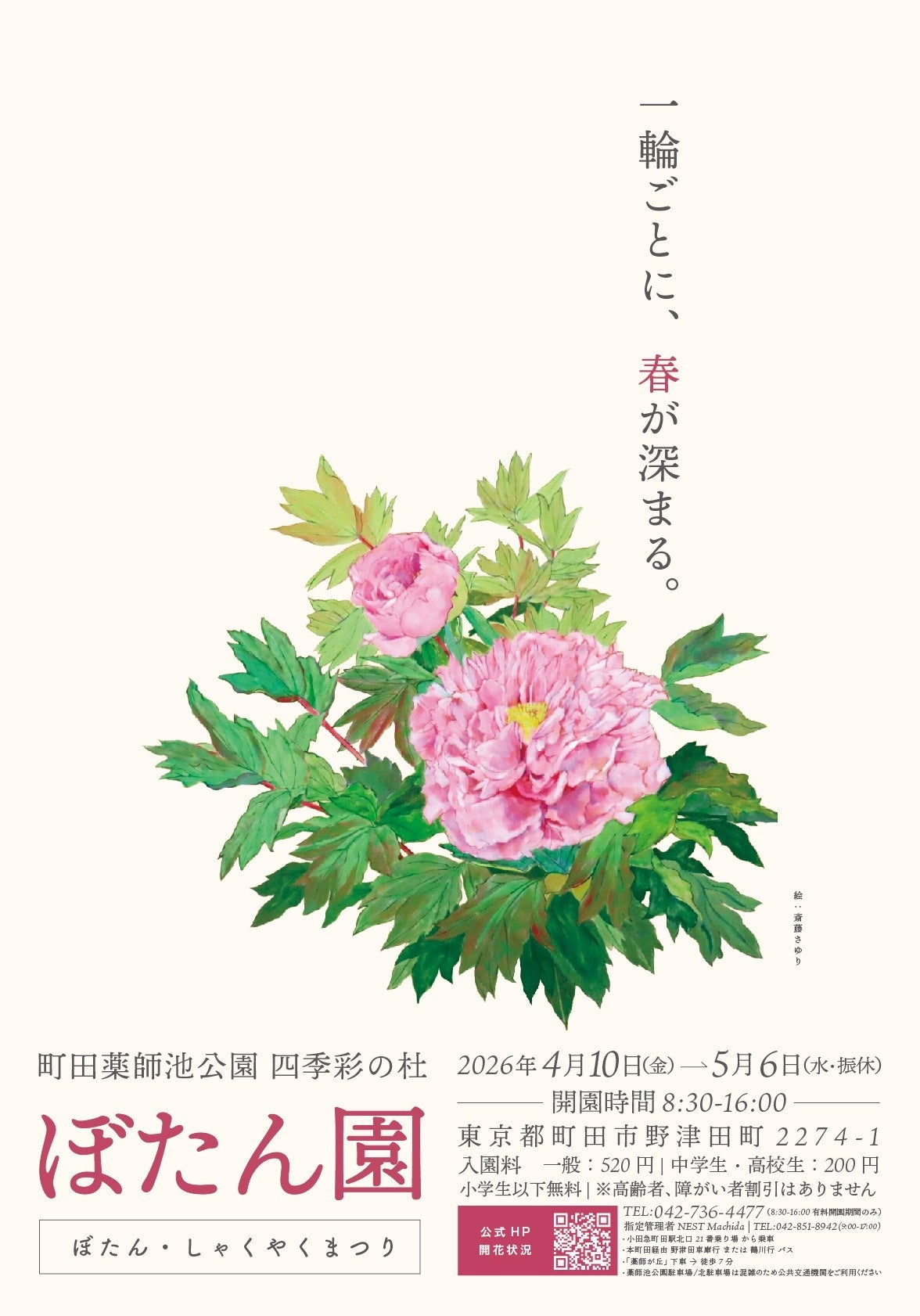 町田薬師池公園四季彩の杜 ぼたん園(東京都町田市)では、2026年4月10日(金)から5月6日(水・振休)まで、「ぼたん・しゃくやくまつり」を開催しています。