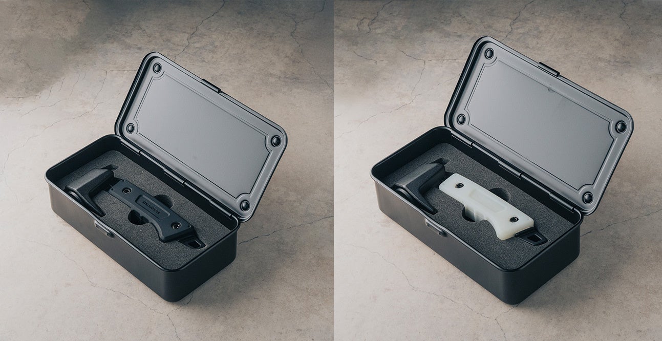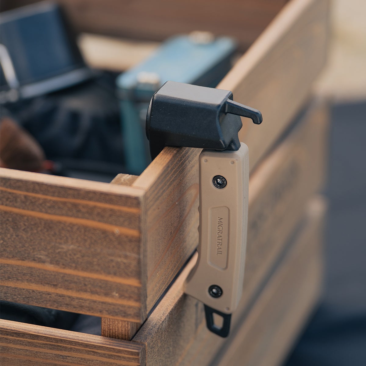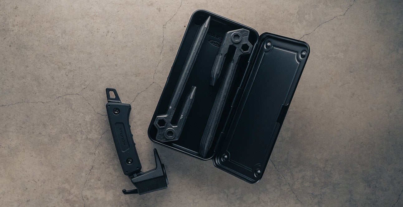 フィットハンマー専用のツールボックス付きをラインナップ。TOYOスチールとコラボレーションした、MIGRATRAILオリジナルデザインのツールボックスと専用フォームが付属。専用フォームを外すことで、ペグなどを収納できるハードタイプのギアボックスとしても使用できます。MIGRATRAILのペグ「ヘキサステーク」は、ジャストフィットで10本収納可能。フィットハンマーとツールボックスは、使い込むほどに味わいが増していきます。