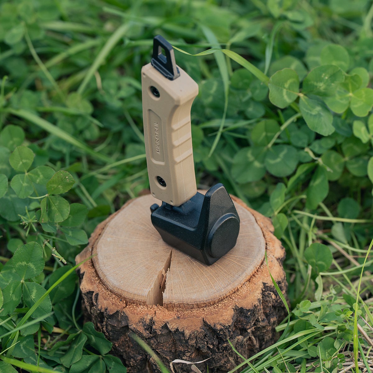 ハンマーヘッドのシールドデザインにより、テーブルなどに掛けることができる。地面ではなく目立つ場所に掛けておけば、コンパクトでもキャンプフィールドで見つけやすく紛失を防ぐ。