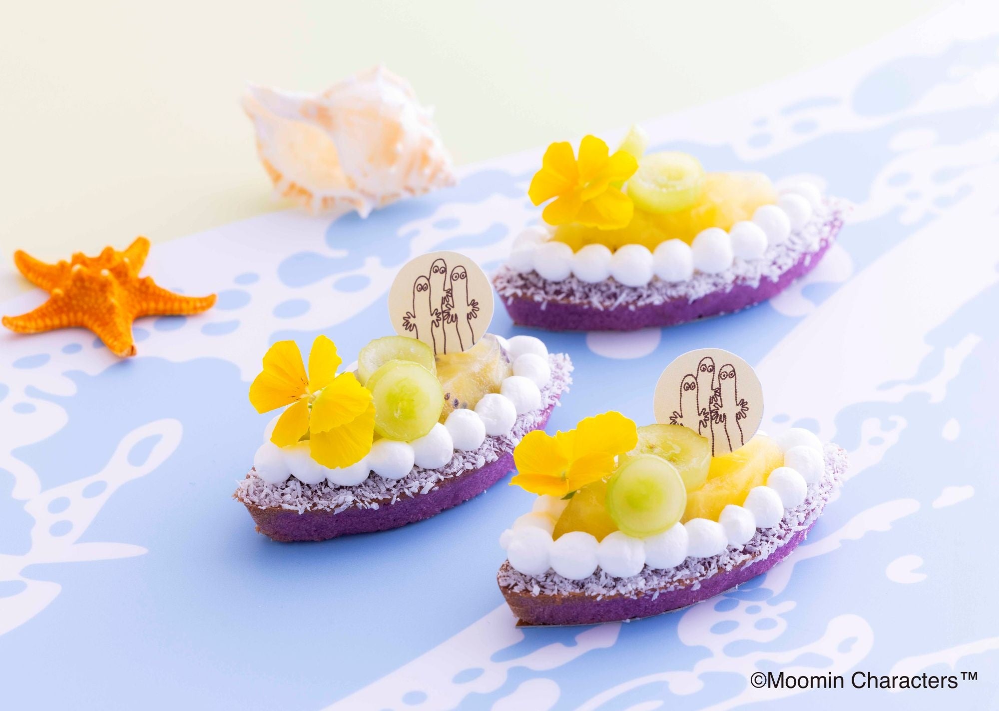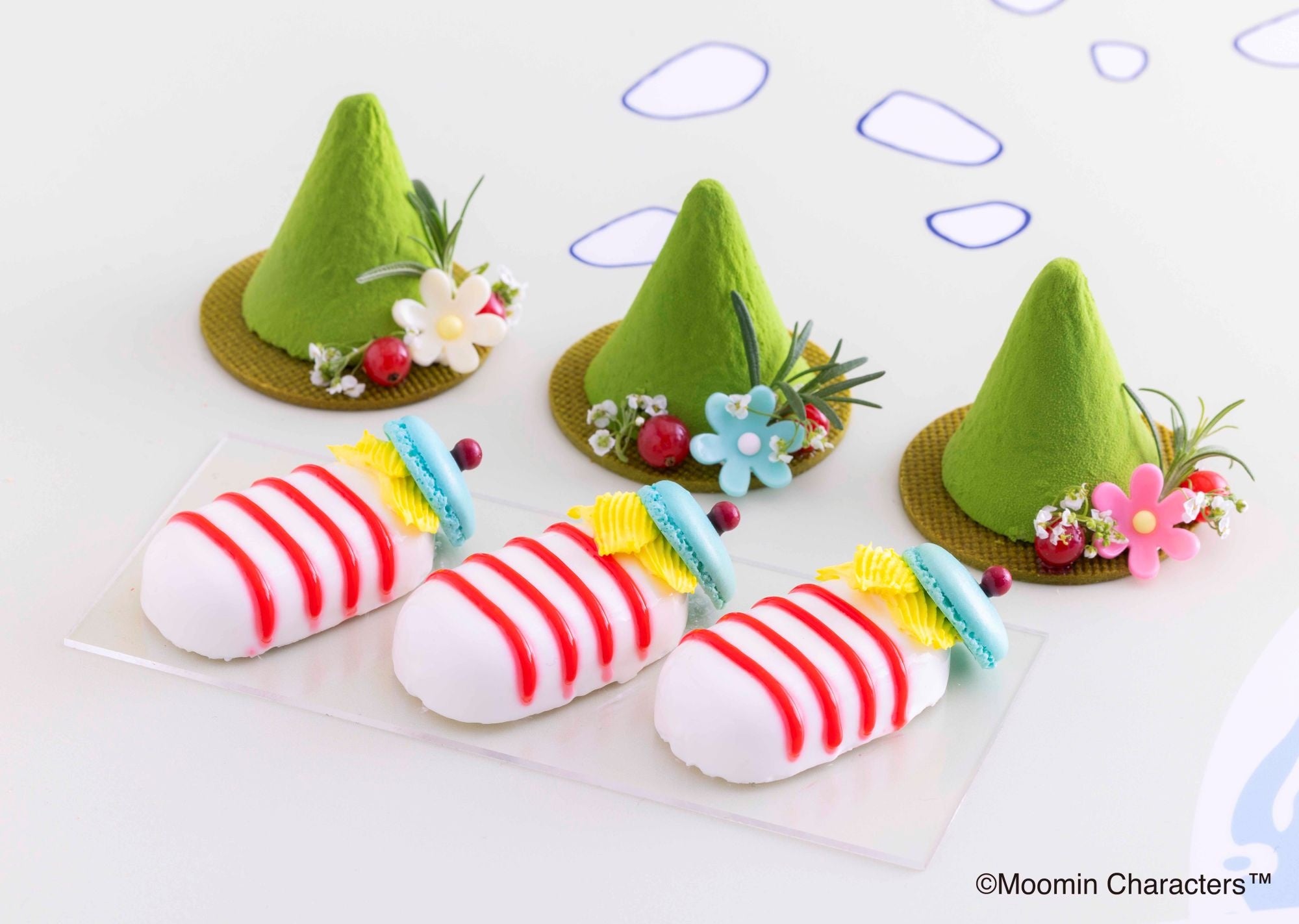 このほかにも、パイナップルなどのフルーツを組み合わせた「ニョロニョロ舟にのる」、「ムーミンパパのハットとステッキ」、「スナフキンの帽子」、「ココナッツトゥーティッキ」など人気キャラクターモチーフのプチケーキを含む20種のスイーツが並びます。