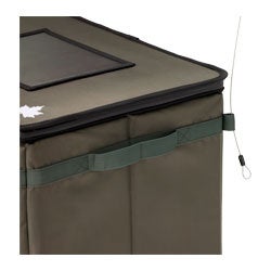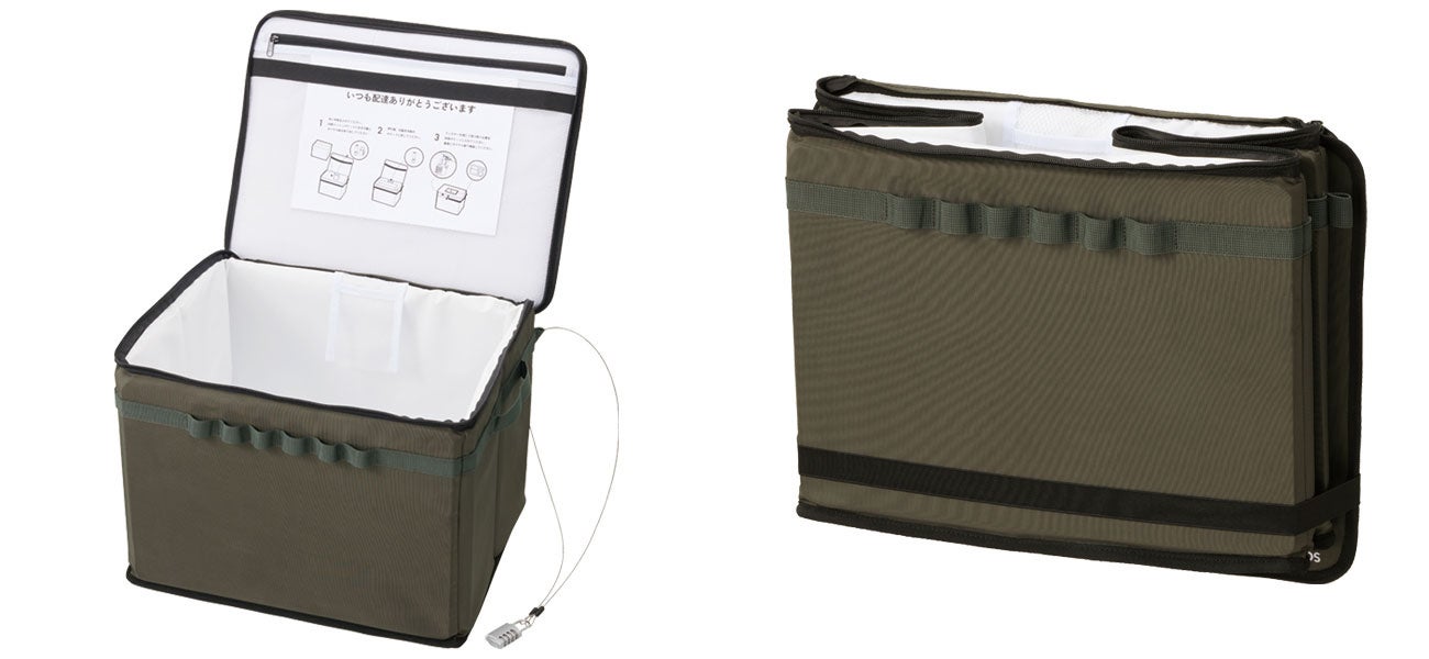 さらに、盗難対策用のダイヤル錠と固定用のワイヤー付きで、防犯面にも配慮しているので、置き配時の心配を軽減するほか、フタ部分や側面には撥水加工を施した生地と、底面には耐水性・耐久性に優れたターポリン生地を採用することで、晴雨関係なく屋外設置に対応します。また、使用しないときはコンパクトに折り畳めるので、保管場所を取らず、収納も簡単です。