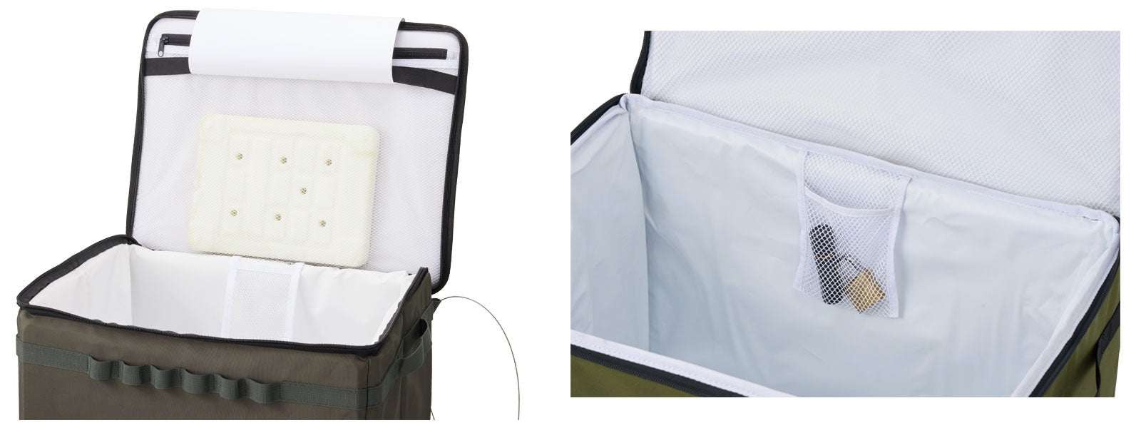 内側には、別売りの超強力保冷剤「氷点下パック(R)」や書類が入れられる大型メッシュポケットと、印鑑や小物を収納できる小型メッシュポケットを装備しているので、夏場でも長時間保冷力を保ちながら、置き配ボックスとしても活躍。