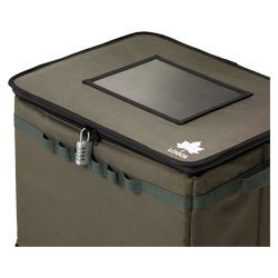 盗難対策用のダイヤル錠と固定用のワイヤー付きで、防犯面にも配慮。置き配時の心配を軽減するほか、フタ部分や側面には撥水加工を施した生地と、底面には耐水性・耐久性に優れたターポリン生地を採用することで、晴雨関係なく屋外設置に対応。