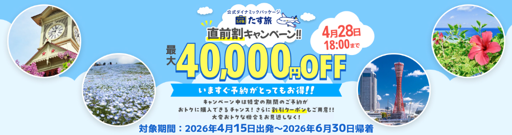 【WEB予約限定】期間限定で、スカイマーク公式ダイナミックパッケージ「たす旅」直前割キャンペーンを開催中。最大40,000円OFFクーポン配布♪