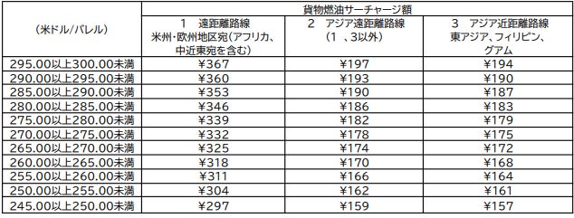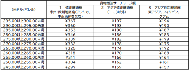 2026年4月23日から適用される日本発国際貨物燃油サーチャージの基準となる2026年3月23日から31 日のシンガポールケロシン市況価格平均は、1バレルあたり212.18米ドルでした。この場合、適用条件表の「 210.00以上215.00未満」が適用となりますが、政府からの中東情勢を踏まえた緊急的激変緩和措置の補助 の効果を踏まえ、2026年4月23日からは「190.00以上195.00未満」の金額を適用します。これにより、サー チャージ額は1kgあたり220円(米州・欧州など遠距離路線)、119円(アジア遠距離路線)、117円(アジア近距離 路線)となります。