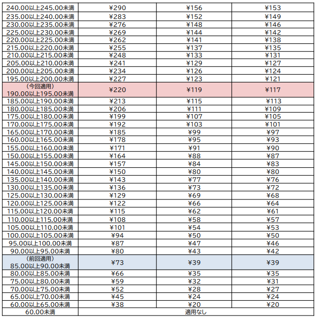 貨物燃油サーチャージテーブル (表示価格は貨物1kgあたり)