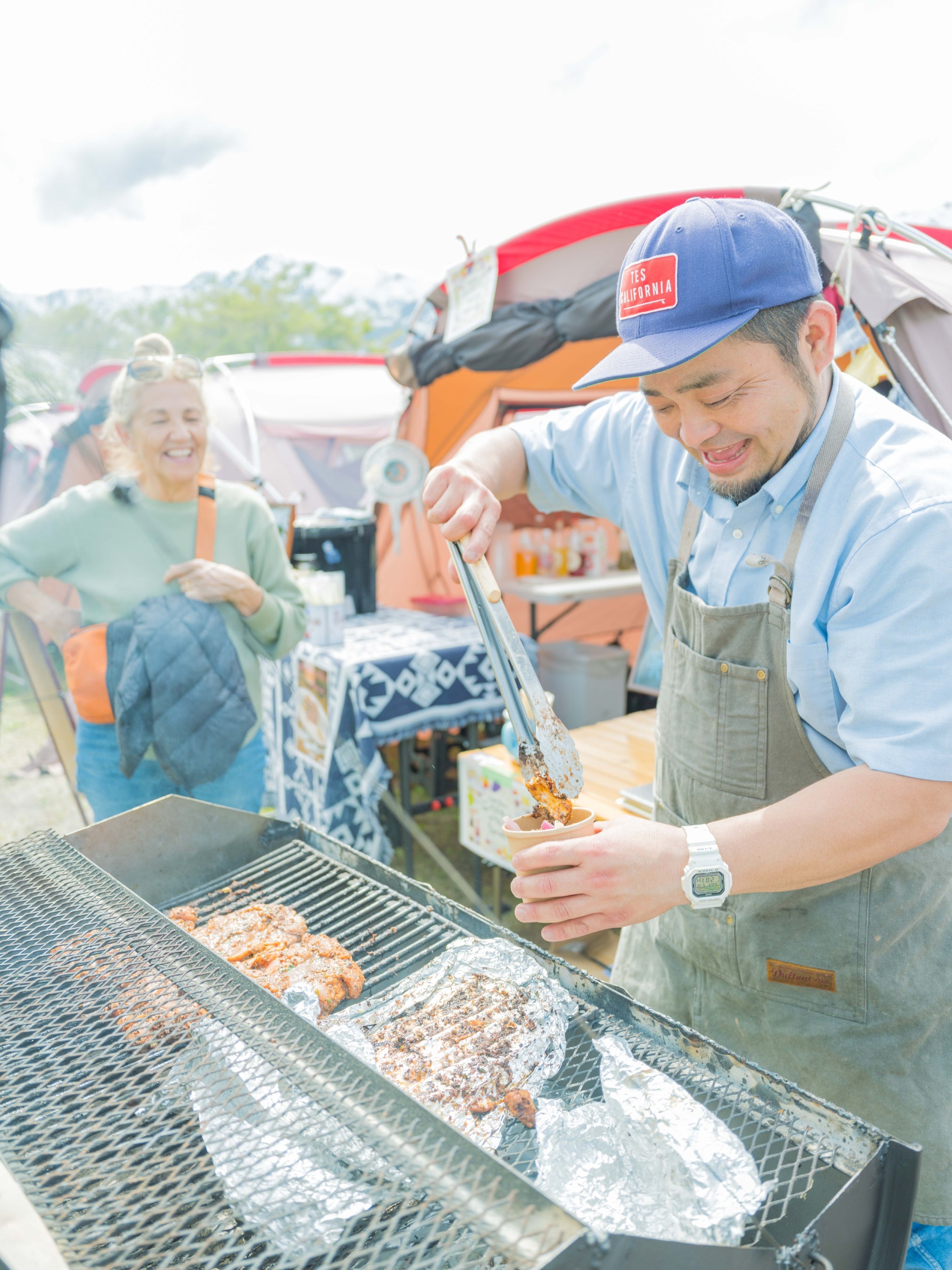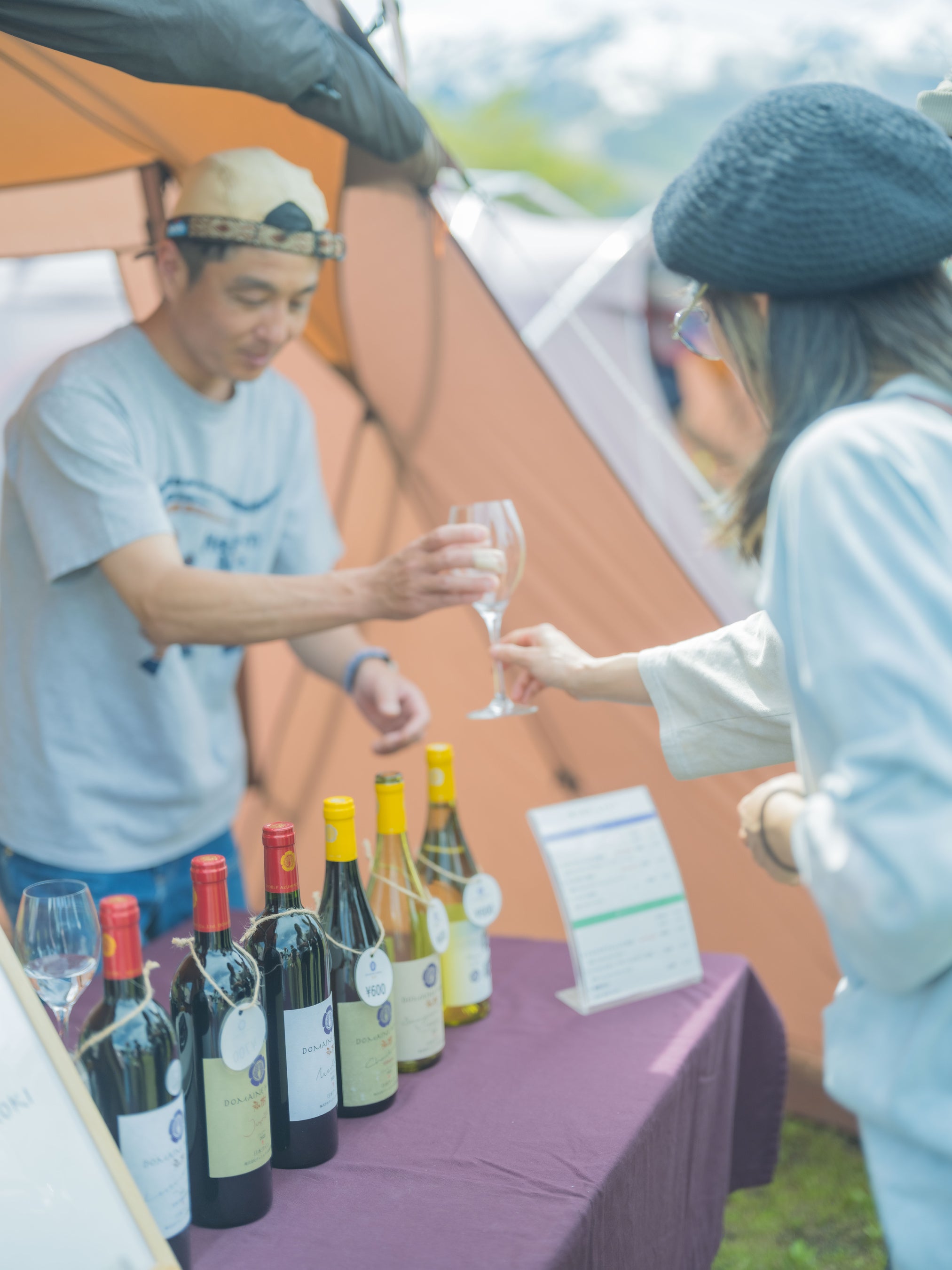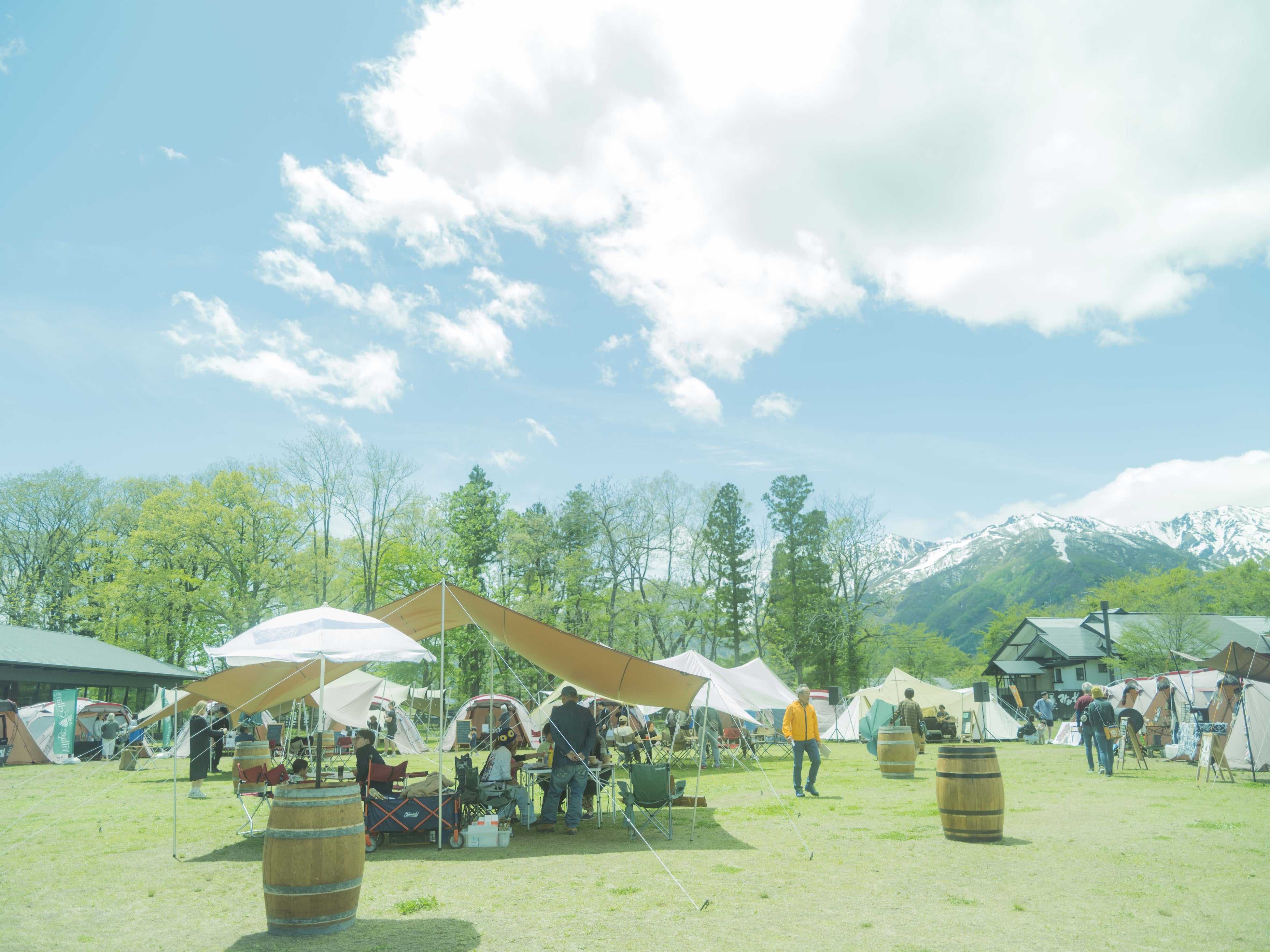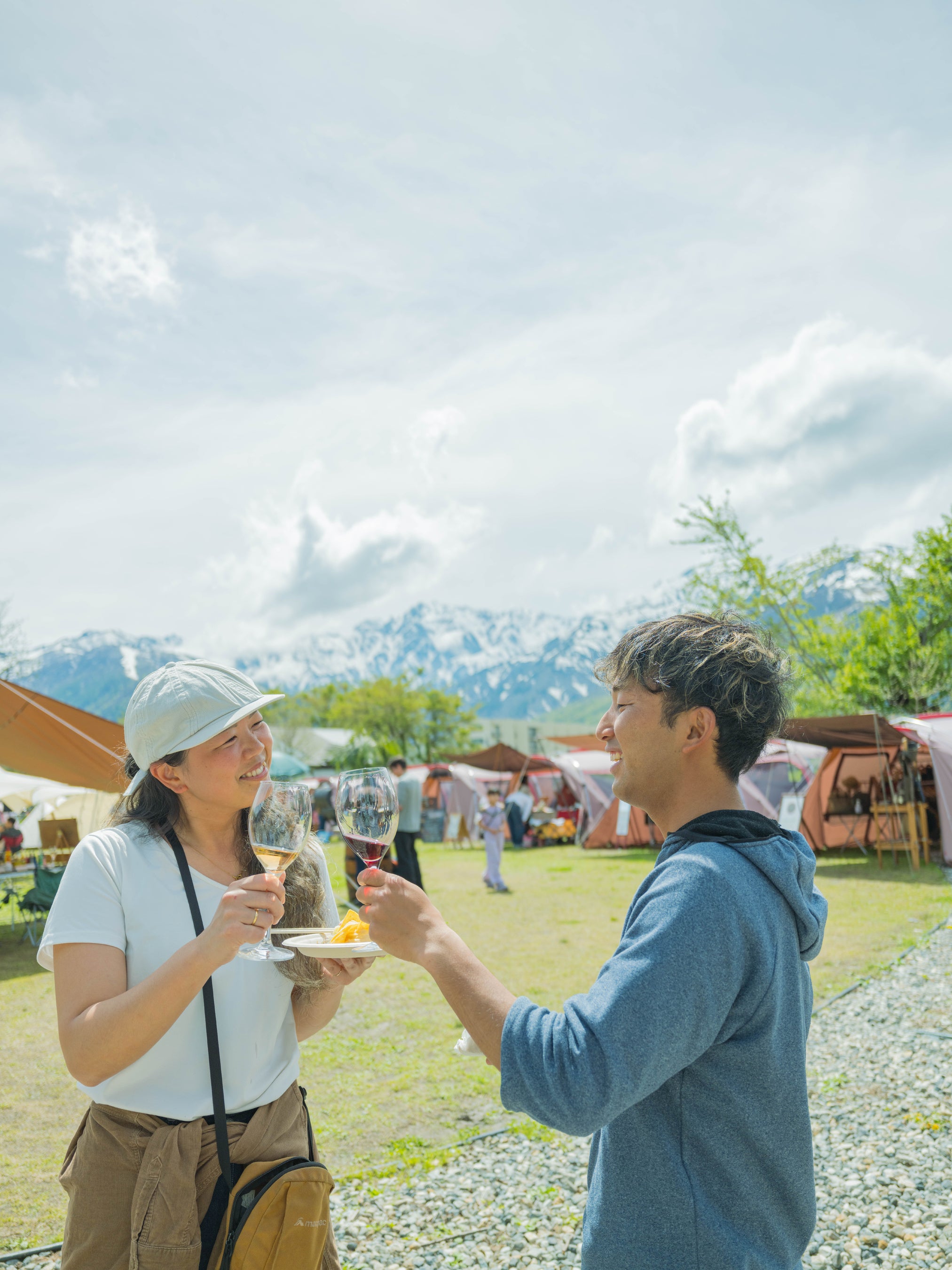会場は「Snow Peak Land Station HAKUBA」。芝生に広がる開放的な空間と雪解けの北アルプスの景色の中で、長野県のワインを気軽に楽しめます。