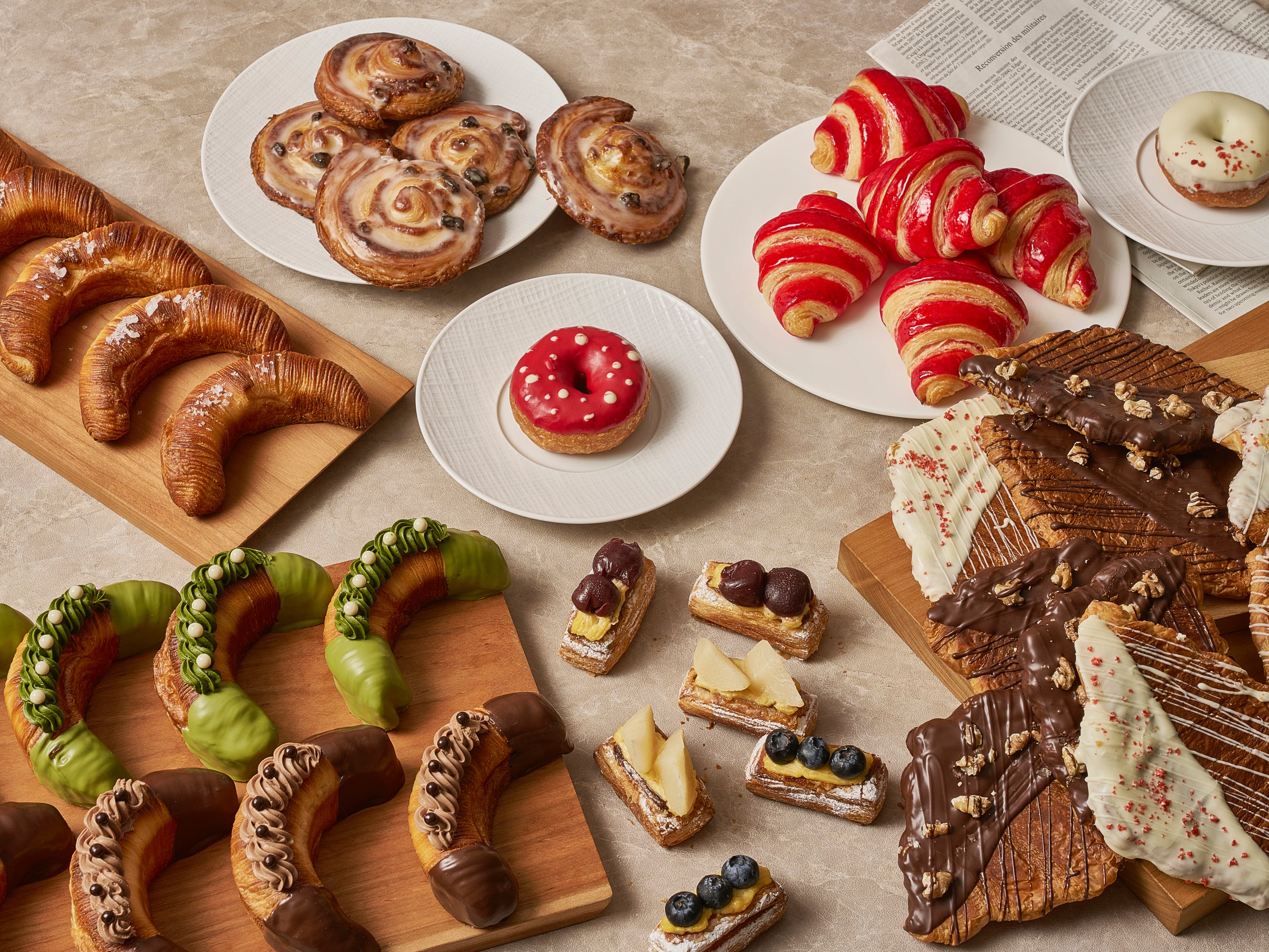 さらに、ストロベリーの鮮やかな色合いが目を引くバイカラークロワッサンや、クーベルチュールチョコレートとナッツの食感を重ねたスマッシュタイプなど、味覚と視覚の双方に印象をもたらすバリエーションをご用意。ひとつ味わうごとに異なる美味しさに出会い、素材や食感の違いをお楽しみいただけます。