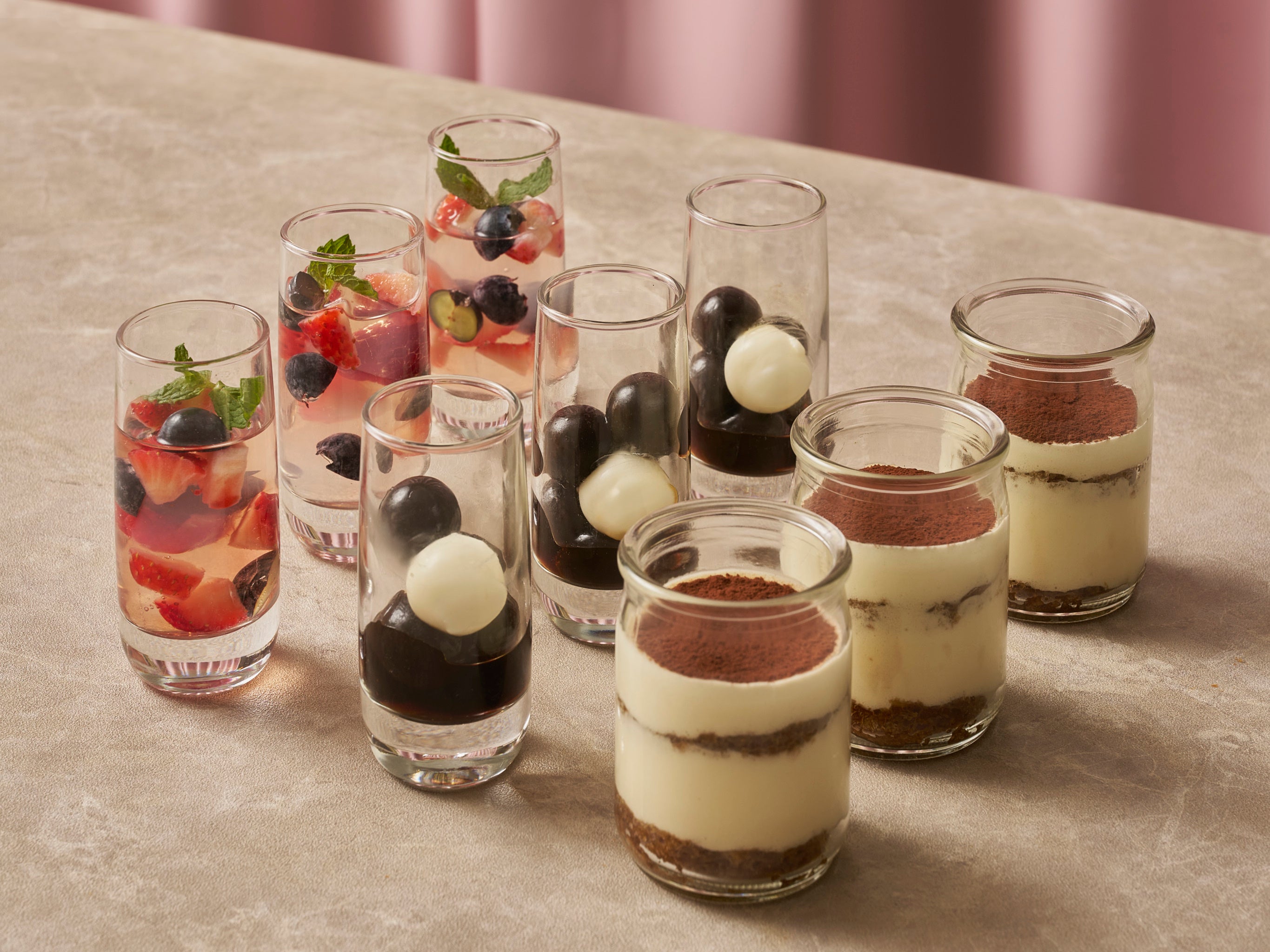 スイーツには、カプセル式コーヒー市場のパイオニアとして創業以来上質なコーヒーを世界中の人々に提供しているNESPRESSO(ネスプレッソ)のコーヒーの豊かなアロマを活かしたティラミスとコーヒーゼリーをご用意。コーヒーゼリーは、小さな球体にしたゼリーをグラスの中で重ねることで、ブラッスリー「RÉGINE」の壁画に着想を得たドットを描き出し、やわらかな食感のコントラストとともに、見た目にも楽しいアクセントを添えます。