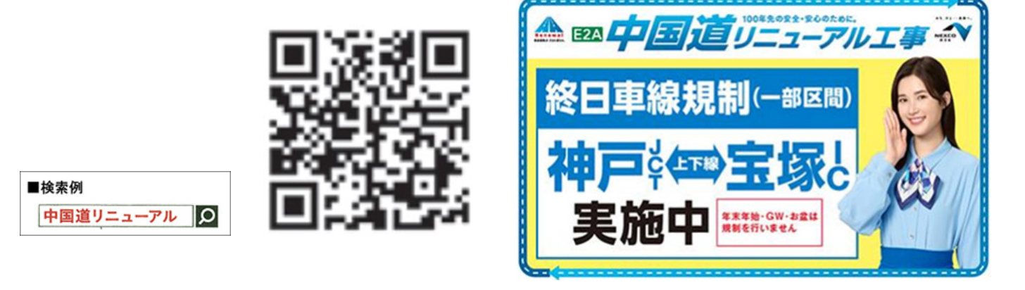 「中国道リニューアル工事専用WEBサイト」において、渋滞予測やう回ルート、リアルタイムの所要時間、工事内容、工事の進捗などを提供してまいりますので、お出かけの際は、最新情報をご確認の上、E1A新名神などへのう回やご利用時間の変更などにご協力ください。
