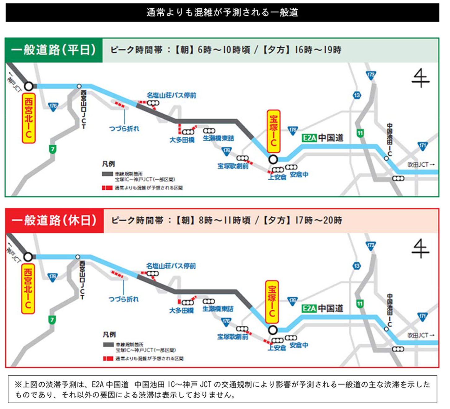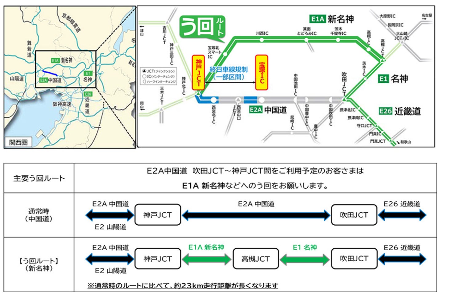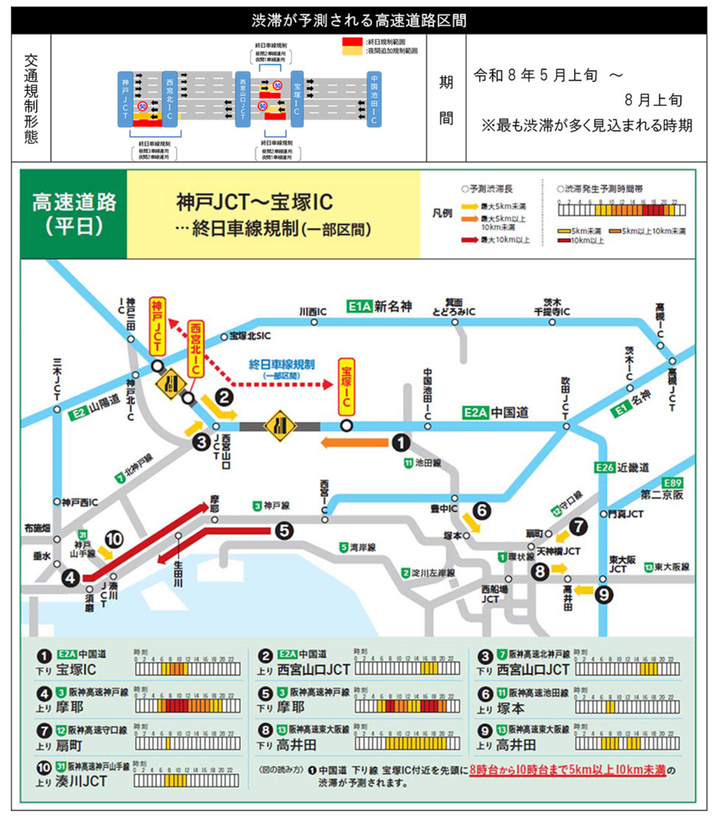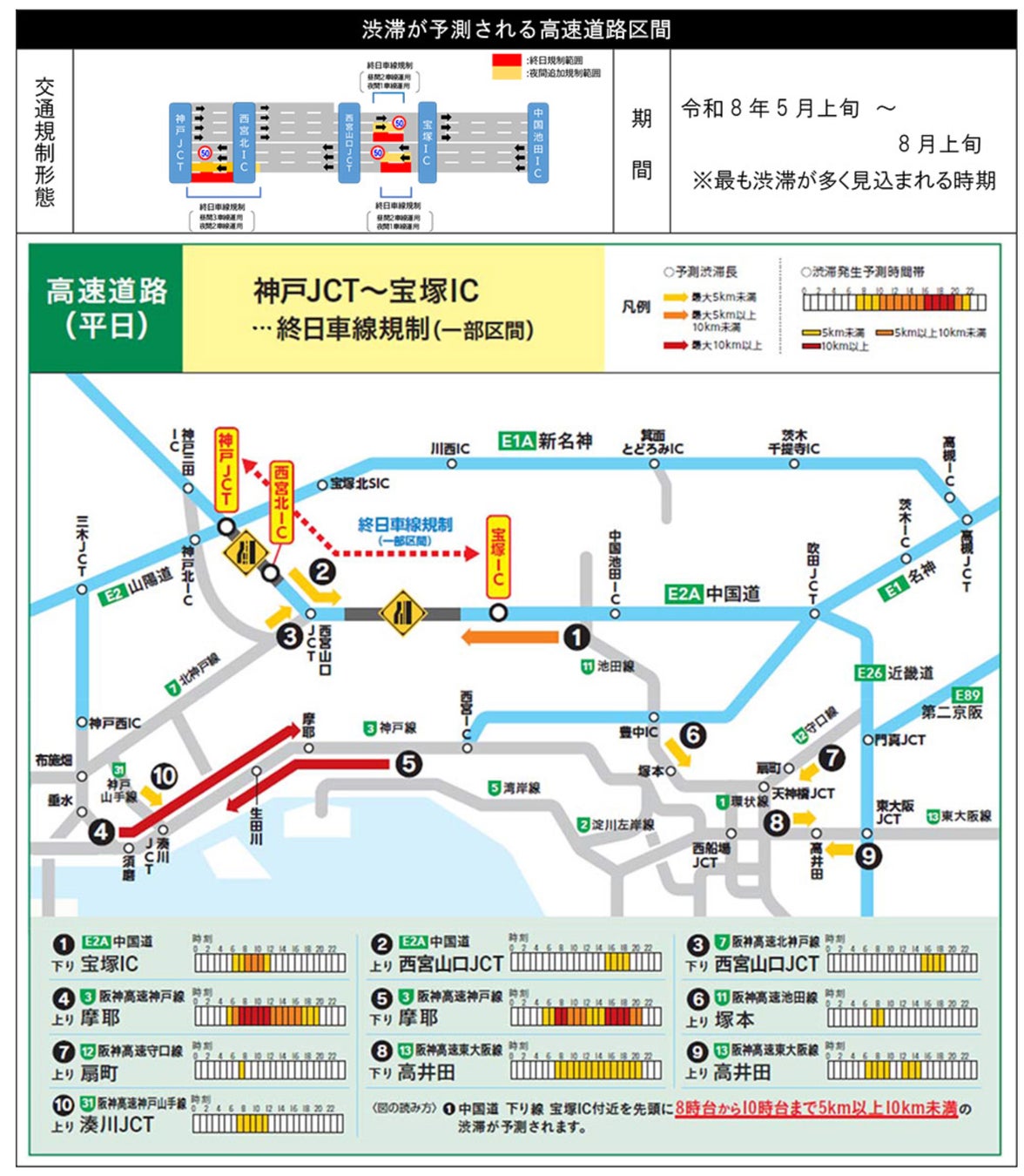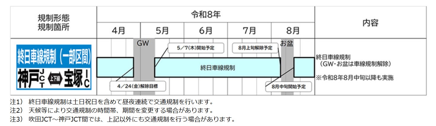 宝塚(たからづか)インターチェンジ(IC)~神戸JCT間では一部の区間で終日車線規制を行います。朝夕を中心に渋滞が予測されておりますので、E1A新名神高速道路(E1A新名神)等へう回いただきますようお願いいたします。
