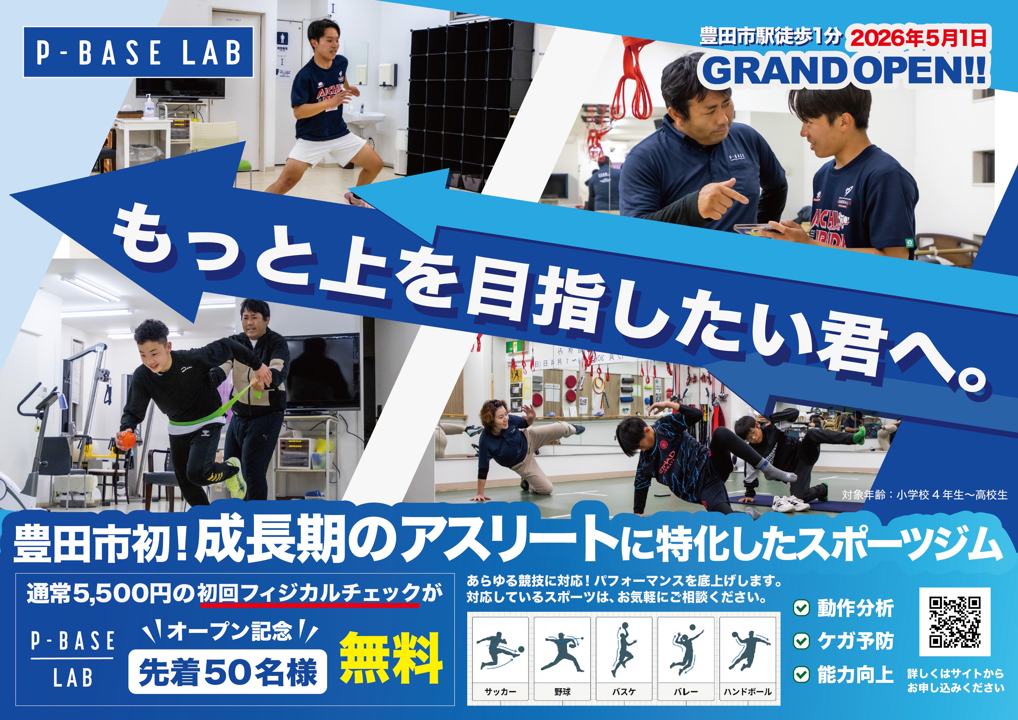 P-BASE LAB(コミュニティジム) 「歩き方を変え、身体を整える」をコンセプトに、理学療法士等の知見を活かしたパーソナルトレーニングやサーキット運動を提供。夕方からは小学生から高校生向けのジュニアアスリート教室も開校。