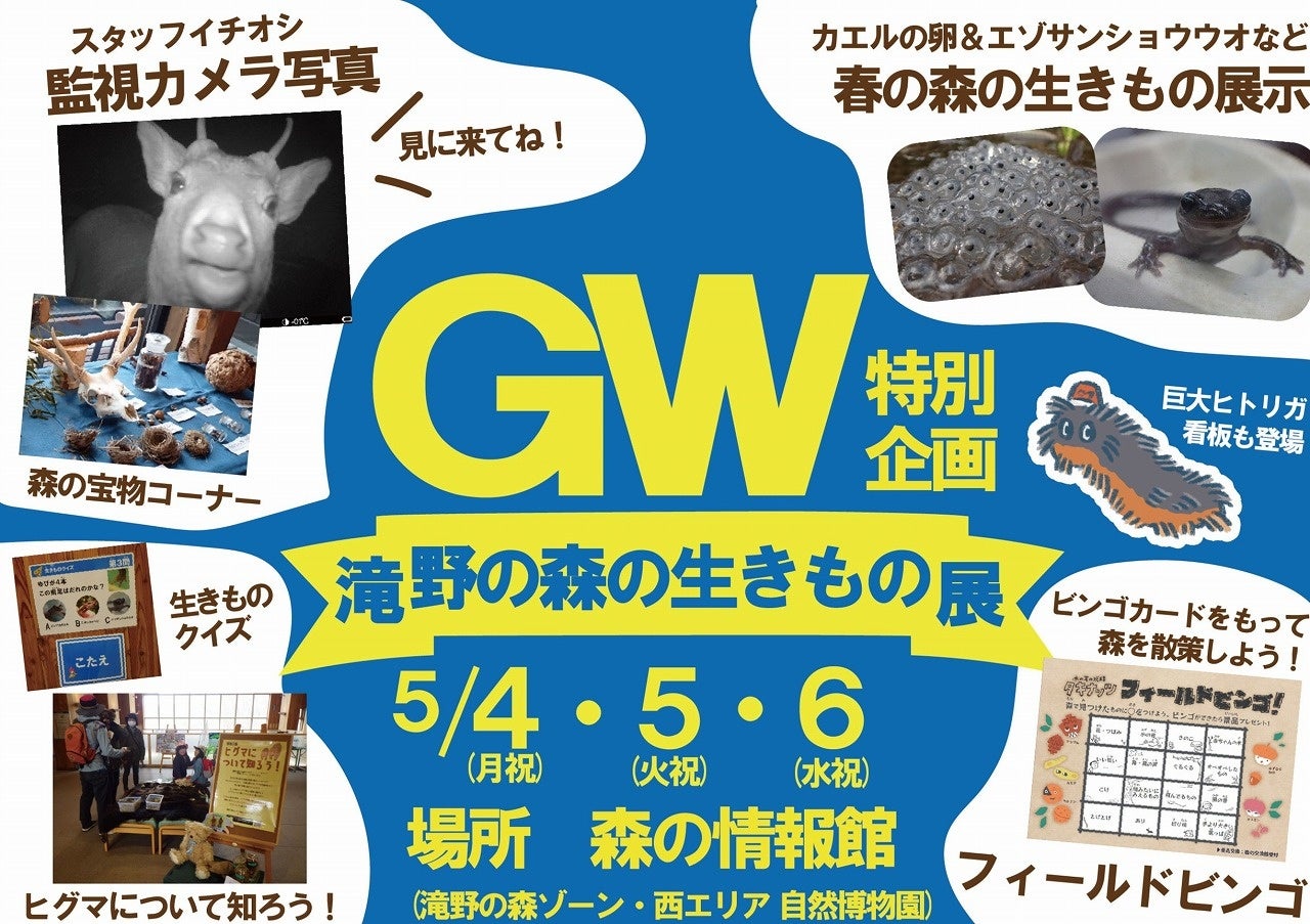 自然豊かな滝野の森でみられる生きものたちを展示や監視カメラの写真などでご紹介します!