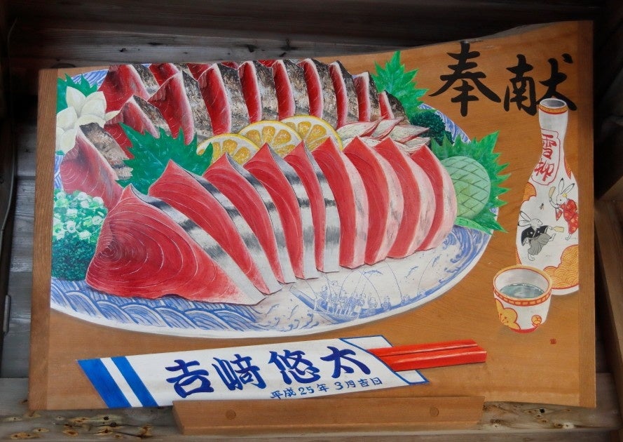 【関連スポット】かつおの絵馬や、町なかにもかつお 久礼八幡宮の「かつお」「タタキ・刺身の盛り合せ」絵馬。かつお絵の仕切弁フタも。 |