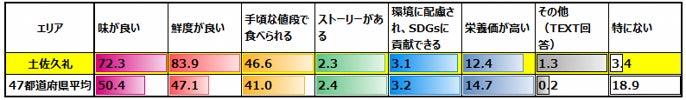 ●『普段、どのくらいの頻度で「かつお」を食べますか?』という問いに対し、「毎日+週1回程度」と答えた割合が、土佐久礼(39.9%)は47都道府県平均(5.4%)と比べて非常に高い。また、「毎日」が土佐久礼(4.9%)で同平均(0.9%)の約5.4倍になる。よって、「土佐久礼は、超高頻度のかつおヘビーユーザー地域である。」と分析できる。