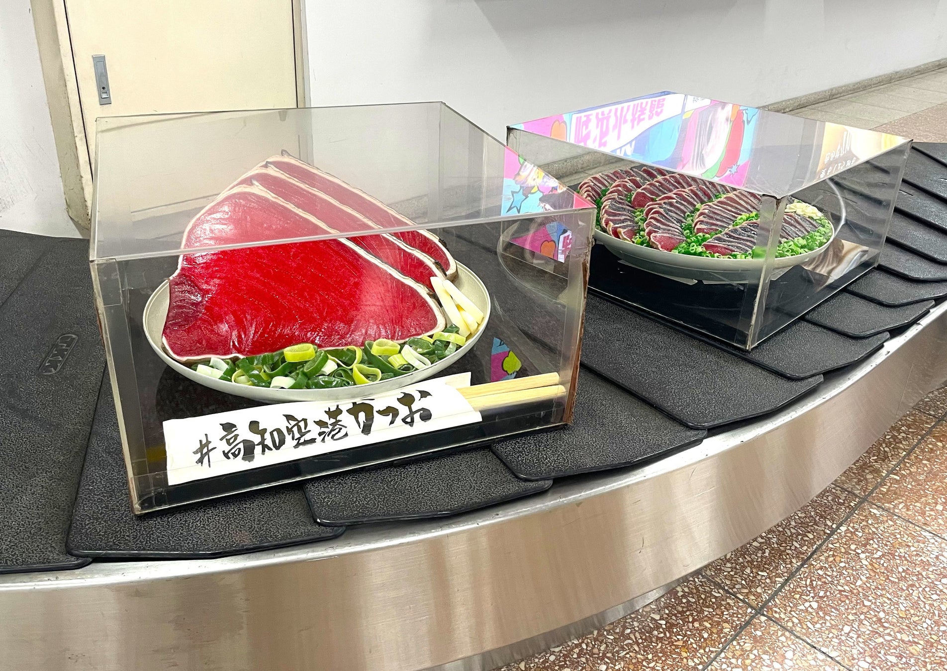 【啓蒙・PR】高知龍馬空港のタタキオブジェ 手荷物ターンテーブルに巨大&実寸タタキ、 丸かつおを設置。高知の玄関口でかつおでお出迎え。 |