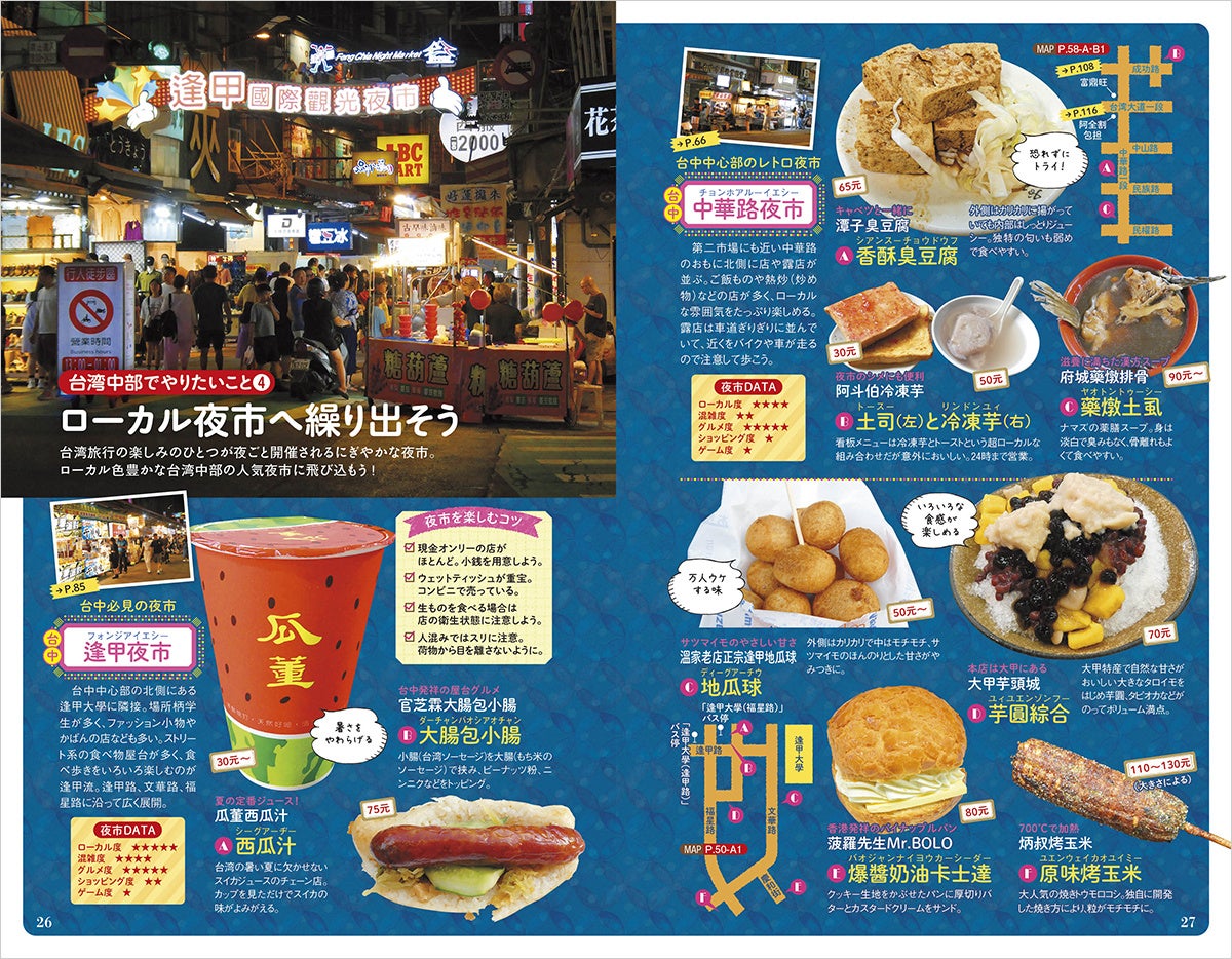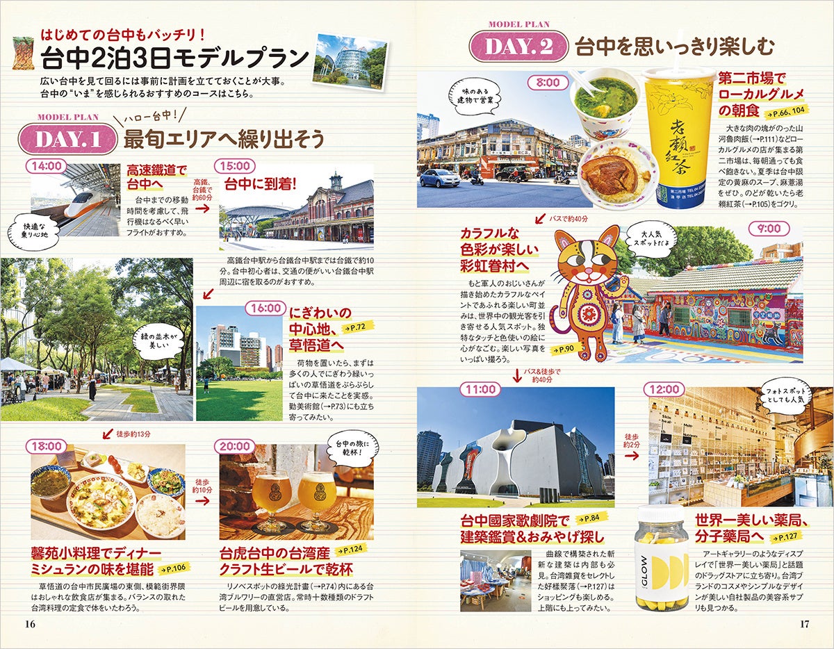 町歩き、絶景、グルメ、建築、老街、夜市、鉄道など、はじめての台中でも楽しめる魅力が詰まった推しスポットやテーマを大特集。お散歩ルートや必見ポイント、必食グルメなどを盛り込んだモデルプランもお役立ち!