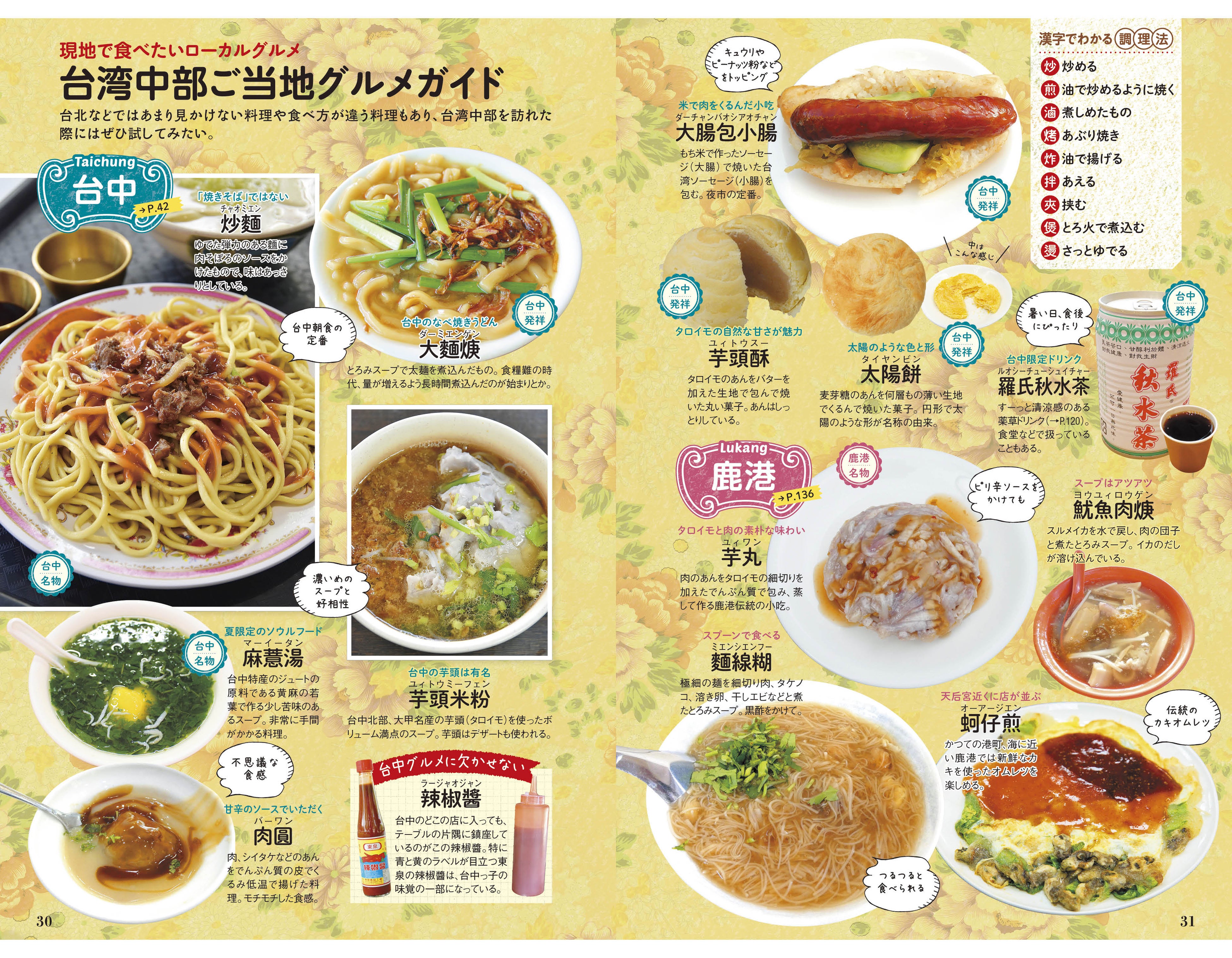 やっぱり現地で食べたいご当地グルメが大集合。台北ではあまり見かけない料理や食べ方が違う、台湾中部ならではの料理も! 台湾旅行のお楽しみ、夜市の人気グルメ特集や、本格派のロースタリーカフェが次々と登場している台中のカフェ特集、乙女心を魅了する世界観が大人気の、台中にしかないリノベスイーツ店「宮原眼科」特集も必見です。
