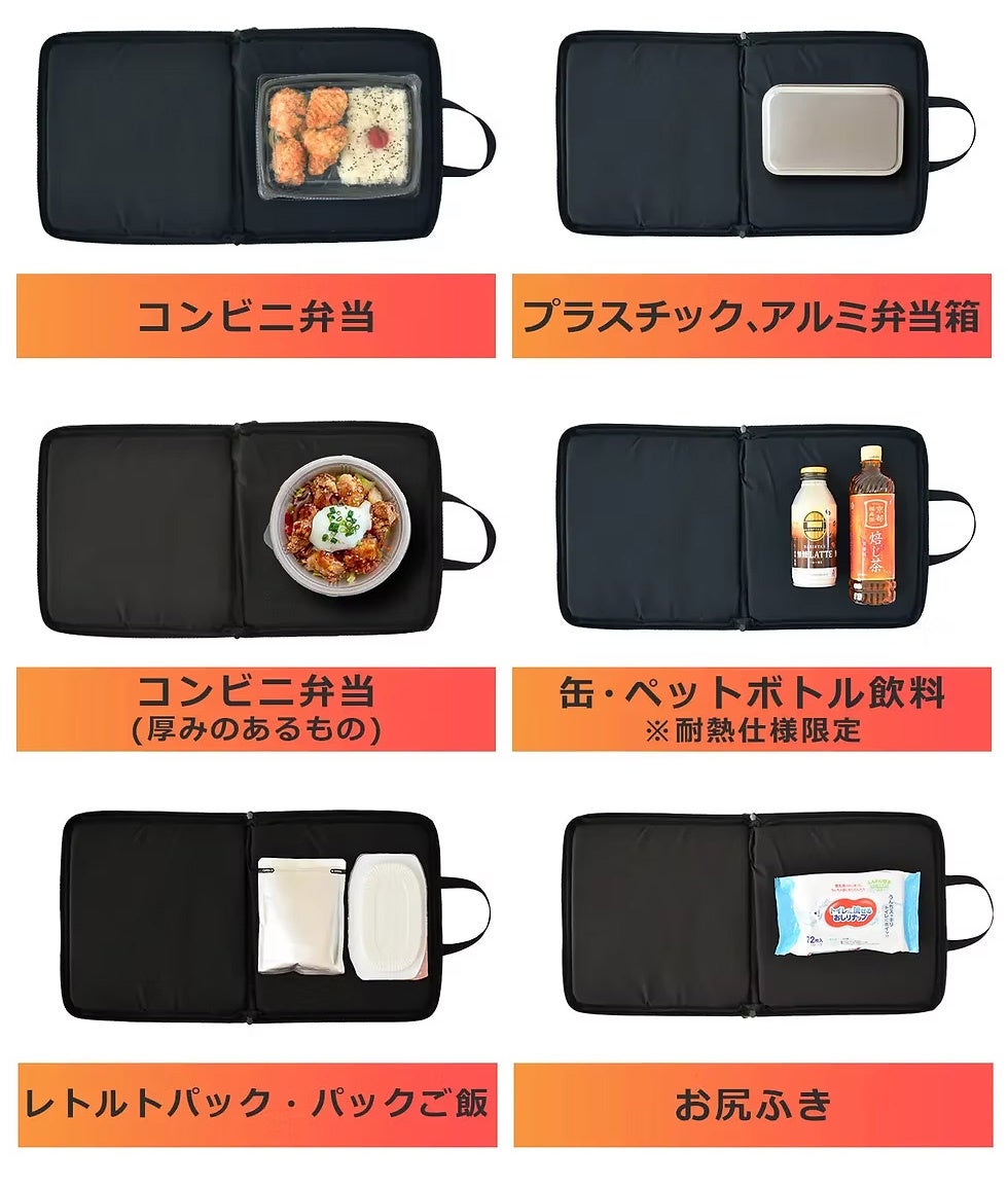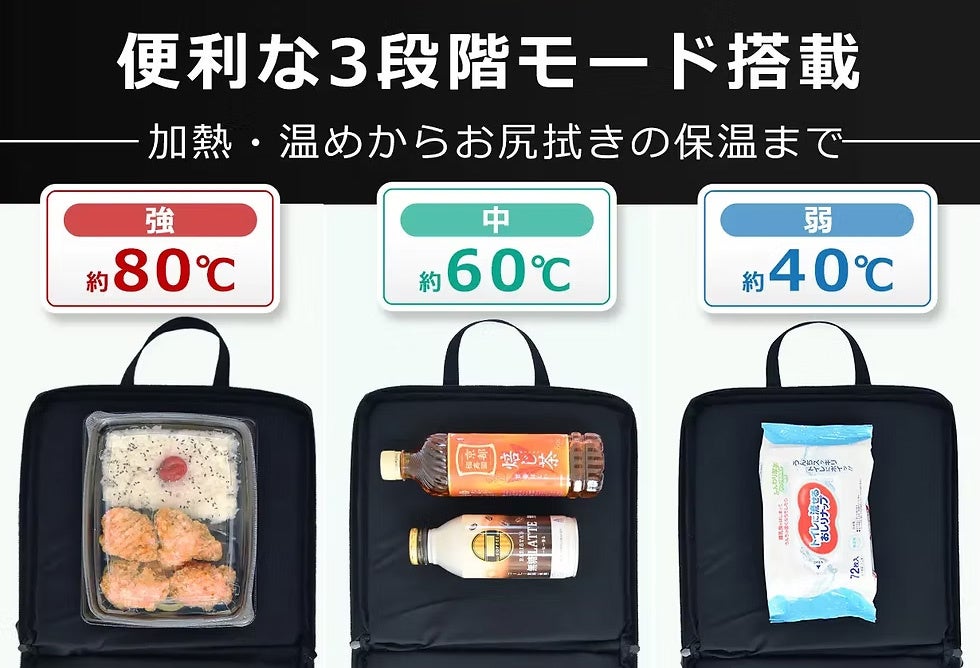 モバイルバッテリーにも対応し、約4分で約80℃まで加熱できる本製品は、アウトドアや車中泊、営業職やドライバーのランチシーン、万が一の災害の避難時など幅広い用途に対応します。