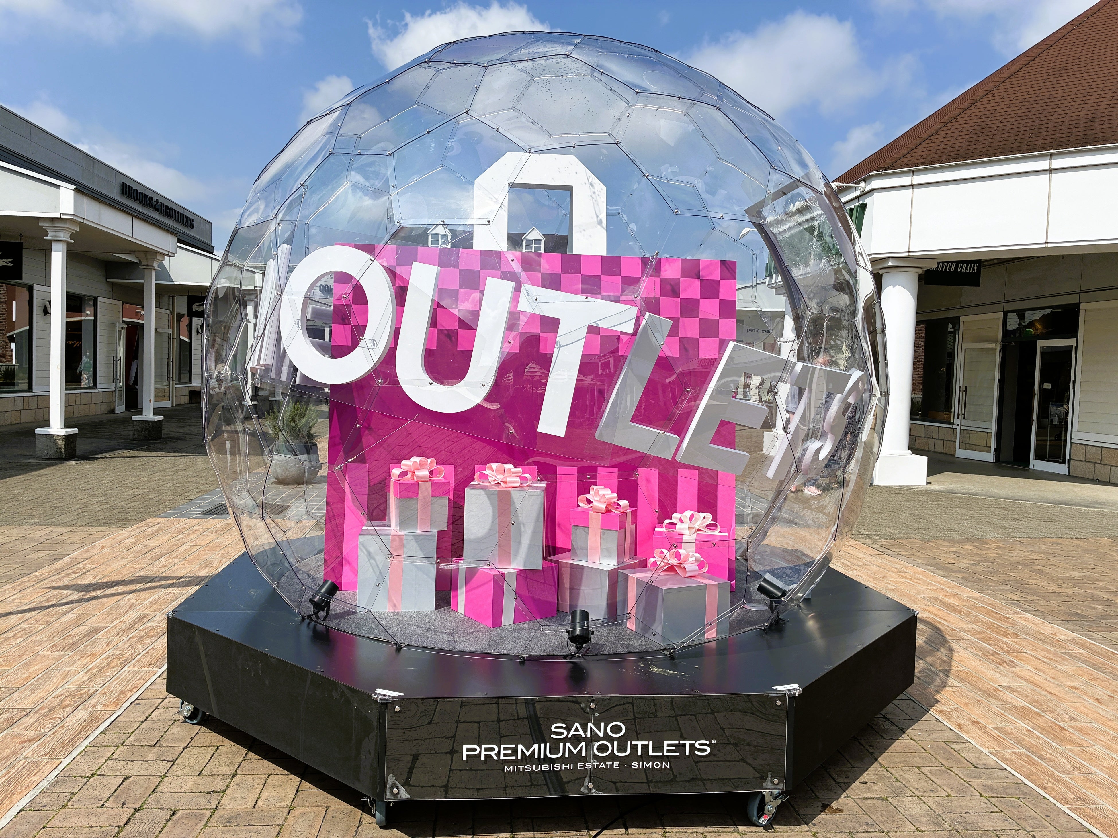 もうひとつのフォトスポットは透明ドーム型で、ドーム内にショッピングバッグやギフトボックスをモチーフにしたオブジェを配し、“お買い物を楽しむ”施設の世界観を表現。出店ブランドの広告スペースとして貸し出しもでき、ブランドの世界観発信や認知向上につながる場としても活用していきます。