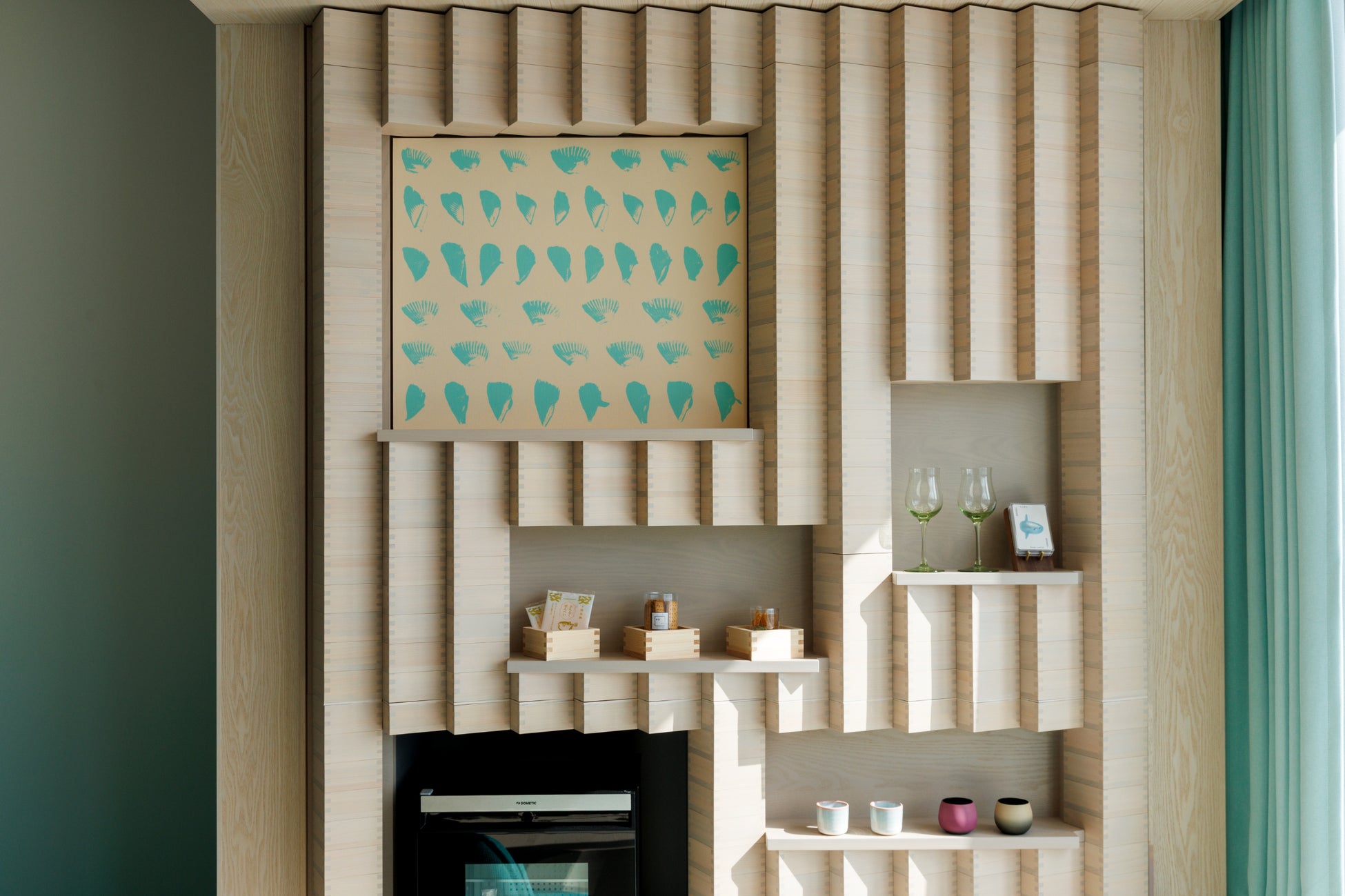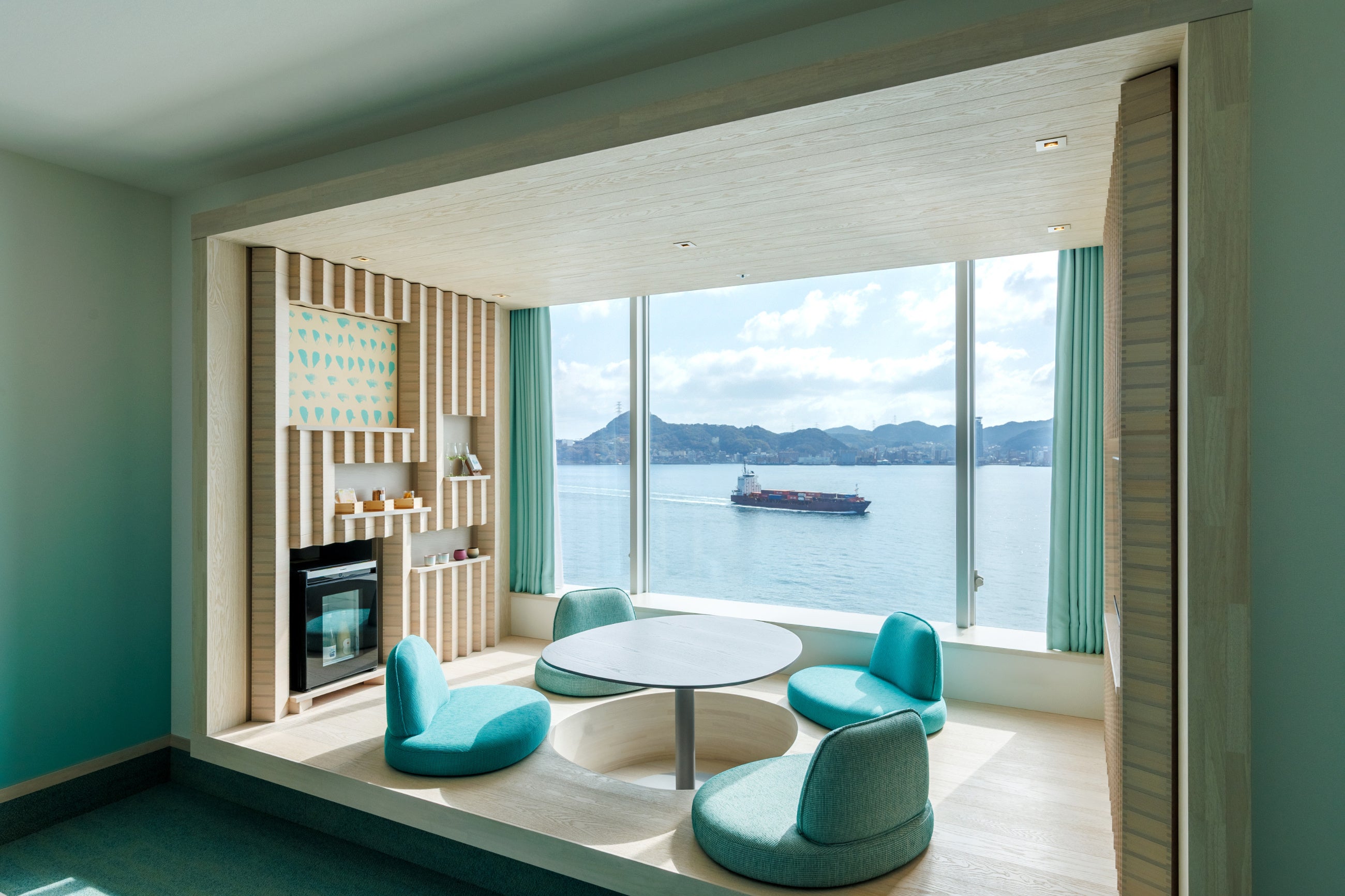 ふく酒ルームは、当ホテル最上階に位置する、3室限定の客室です。ふぐと日本酒をテーマにした室内には、日本酒を飲むときに用いる枡を積み上げたデザインウォールを設え、壁面にはふぐのひれをモチーフにしたアートパネルを展示。関門海峡に面する窓から移り変わる景色を眺めたり、地域の文化を視覚的にも愉しんだりと思い思いに過ごせる空間です。