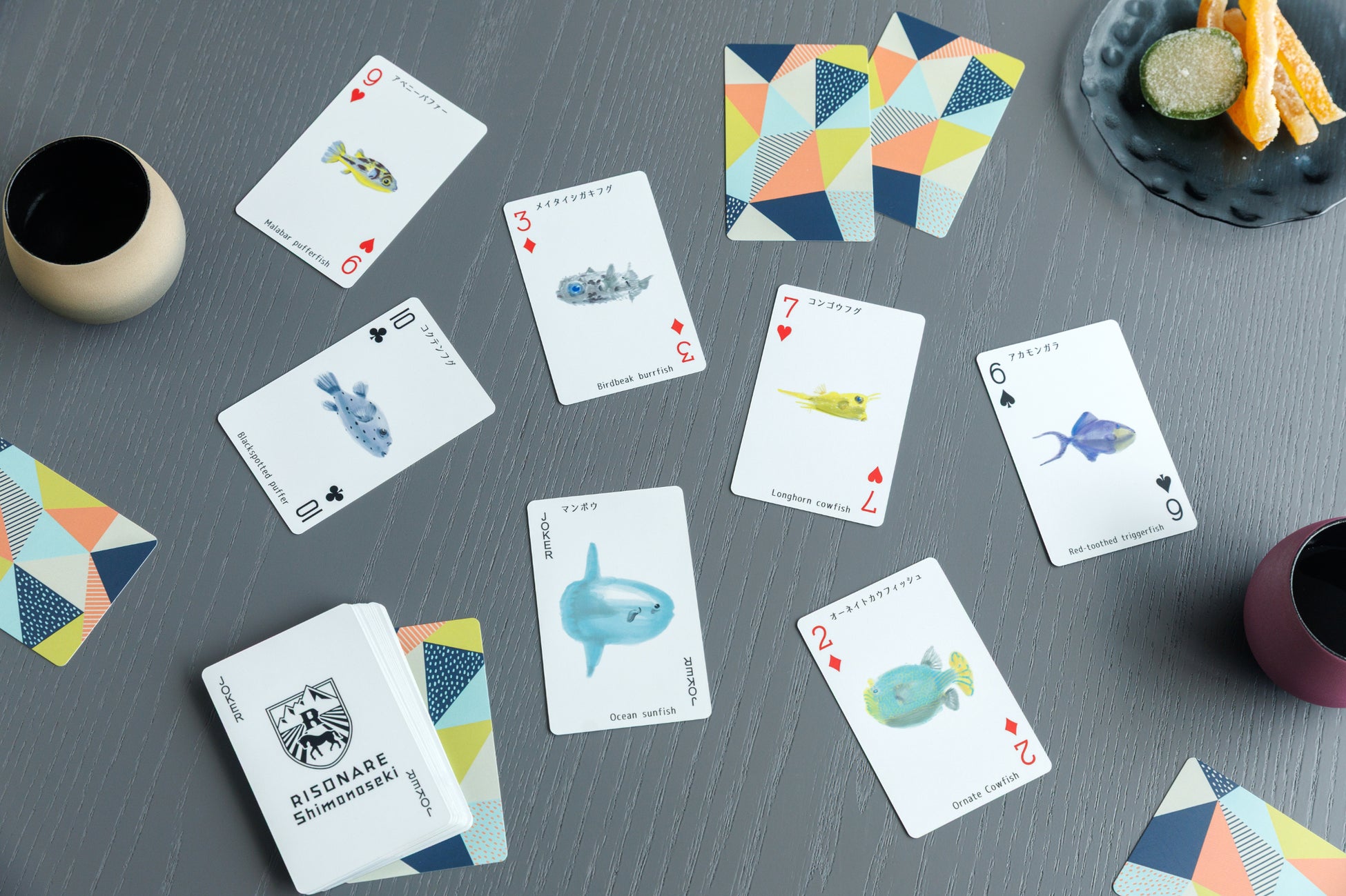 お酒を片手に団らんの時間を過ごせるよう、リビングの中央には心地よい「掘りごたつ」を採用しました。足を伸ばしてくつろぎながら、夜が更けるまで語り合う時間は旅の醍醐味です。さらに、滞在を盛り上げるのがオリジナルの「ふくトランプ」。ふぐの展示種類数世界一を誇る市立しものせき水族館「海響館」に展示されているふぐをデザインしたカードで、遊びながらふぐに親しみを持つことができます。ただ泊まるだけではない、知的好奇心と遊び心をくすぐるアイテムが、思い出深い一夜を演出します。