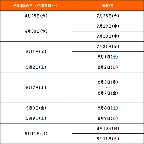 乗船予約は4月下旬より順次受付開始いたします。皆さまのご乗船を、心よりお待ちしております。
