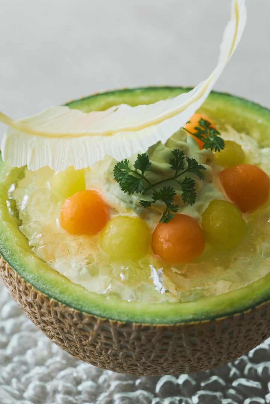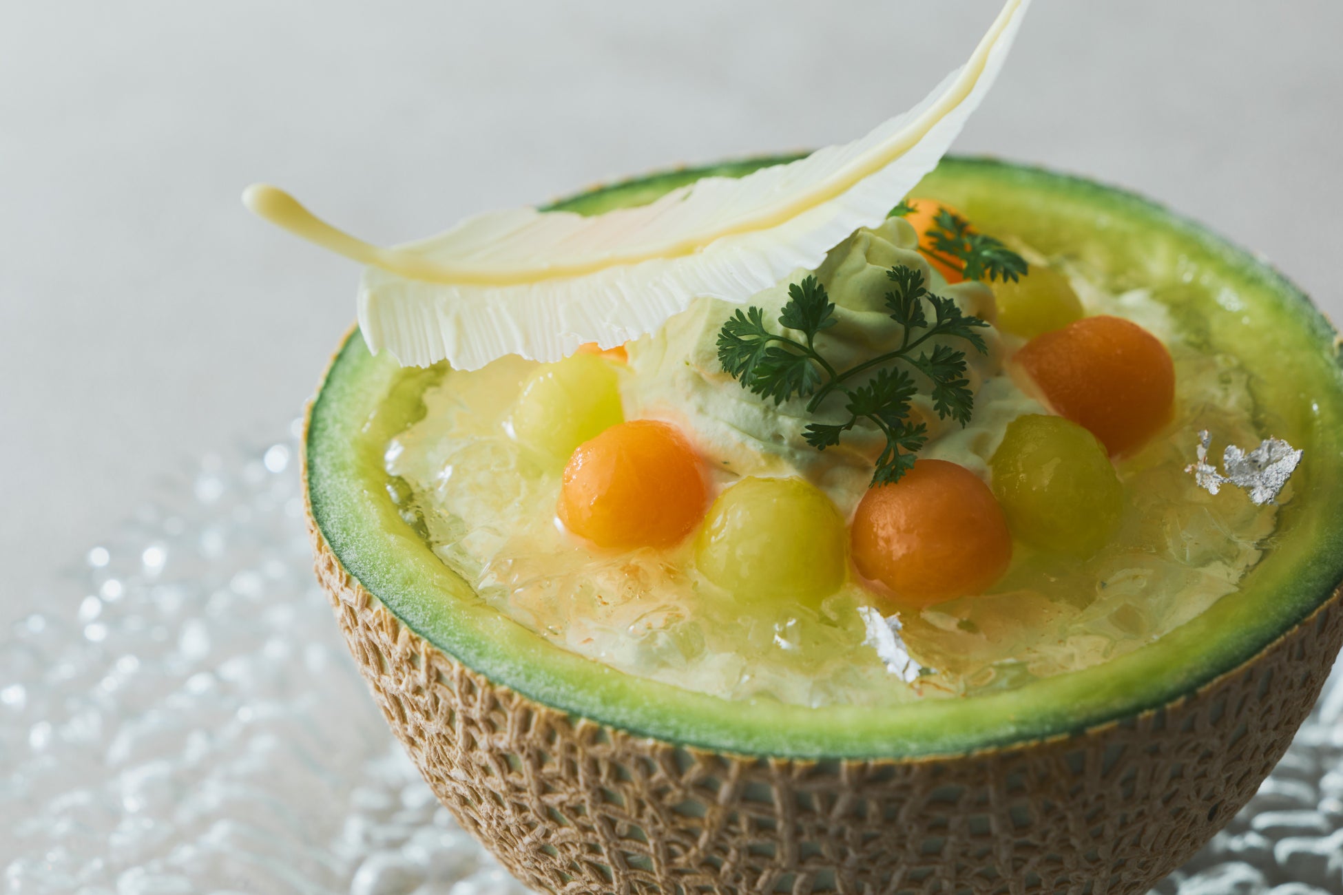 メロンを器に仕立てた、初夏の光をまとう季節のパルフェです。瑞々しい2種のメロン果肉を主役に、清涼なサイダーのジュレと柔らかな杏仁ミルクプリンが重なり合い、繊細なホワイトチョコの羽と銀箔が至高のひとときを華やかに彩ります。果実本来の甘みと香りをダイレクトに愉しむ一皿です。