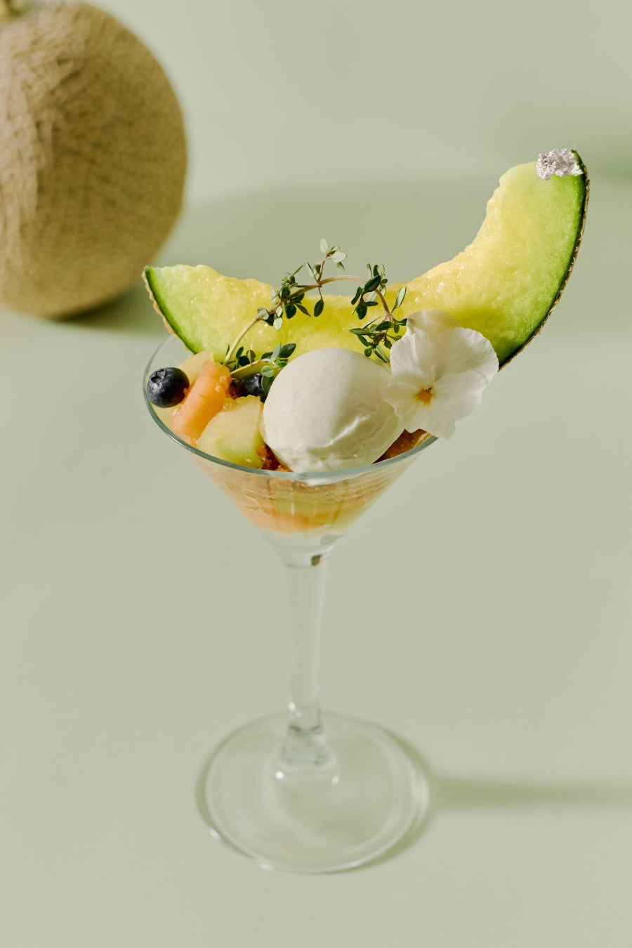 淡いパステルグリーンのメロンホワイトソーダに軽やかなヨーグルトのエスプーマをふんわりと添え、可憐なエディブルフラワーを飾りました。